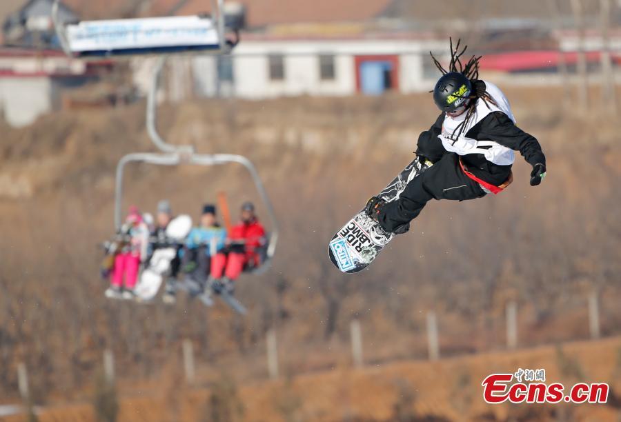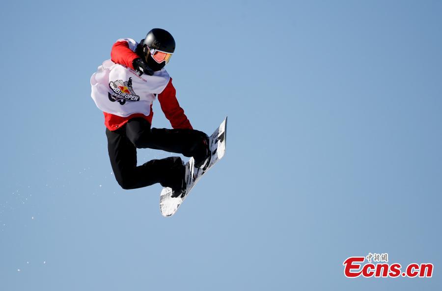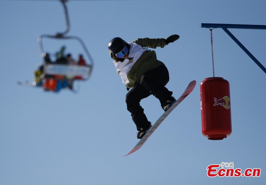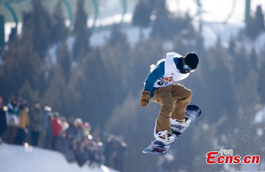 A snowboard rider competes in the 14th Red Bull Open National Qualifier at the Nanshan Ski Resort in Beijing, Jan. 9, 2016. As it enters its 14th year, the Red Bull Open has become one of the most talked about winter sport contests in the world. With Beijing hosting the Winter Olympics in 2022, snowboarding is rapidly gaining popularity in China. (Photo: China News Service/Du Yang)