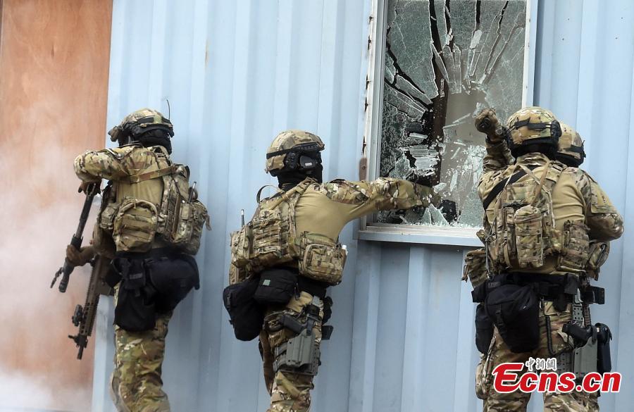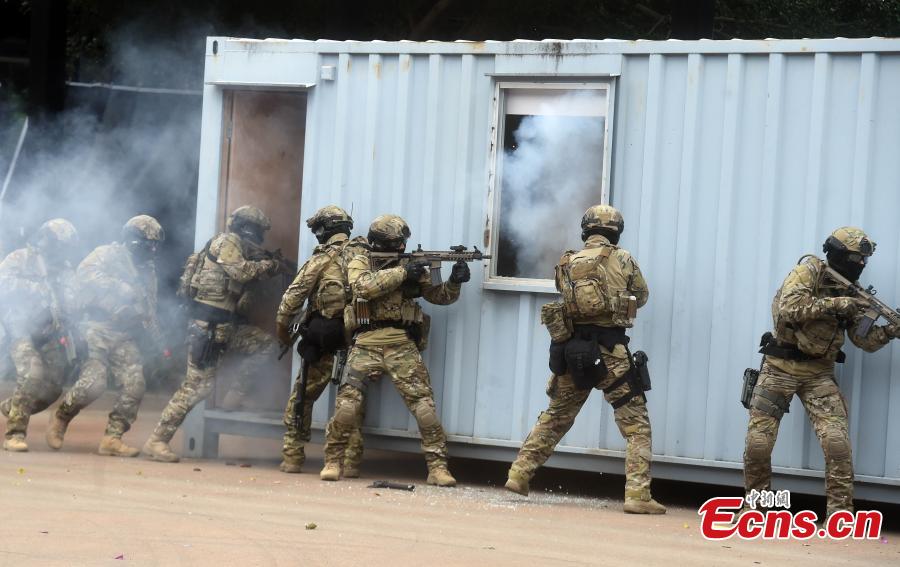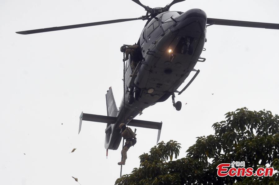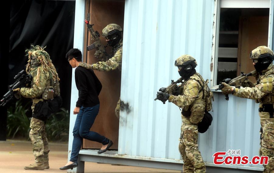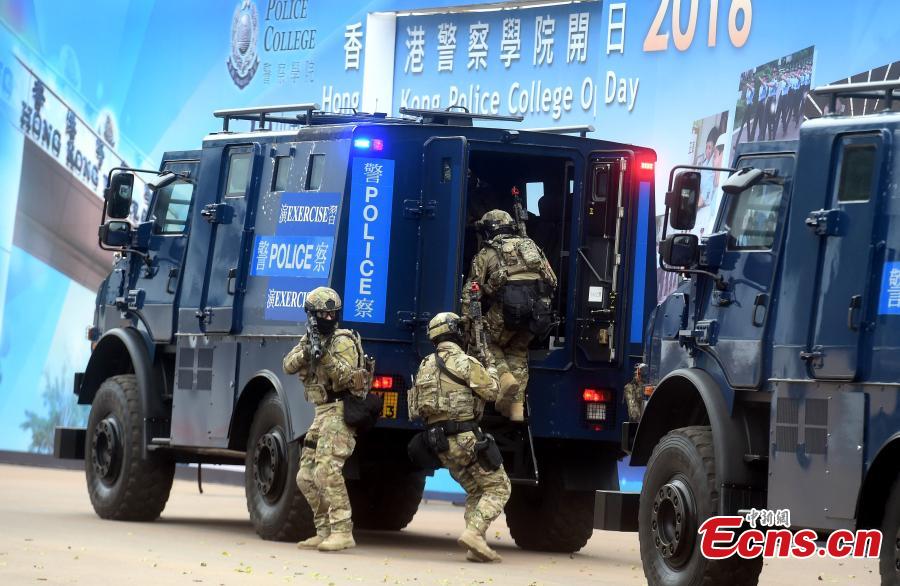 Members of Special Duties Unit (popularly known as the Flying Tiger Squad) take part in a hostage rescue drill on the open day to celebrate the 10th anniversary of the Hong Kong Police College in Hong Kong, Jan. 10, 2016. An array of fun-filled activities was held including performance and demonstrations staged by Special Duties Unit, Police Dog Unit and Police Band. (Photo: China News Service/Zhang Yu)