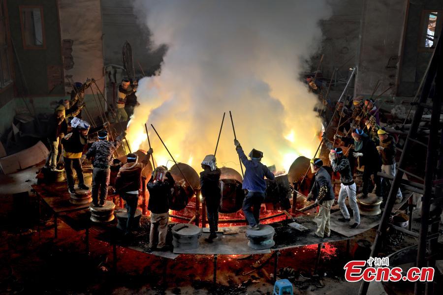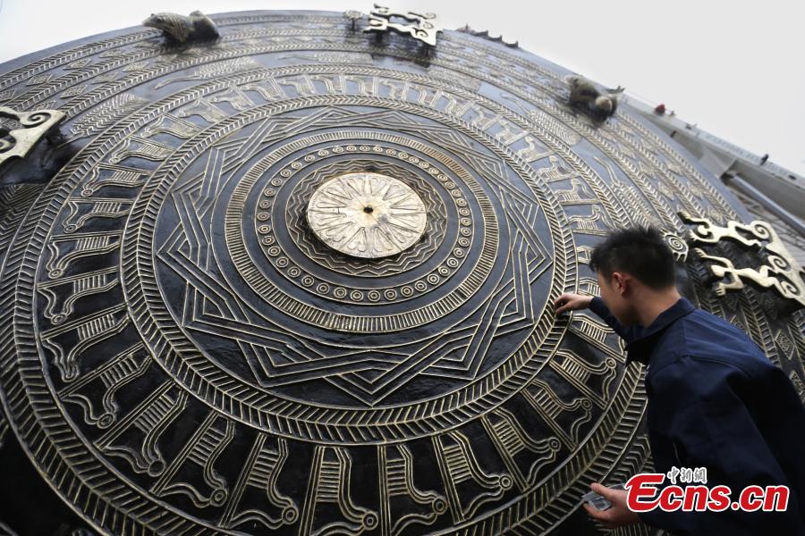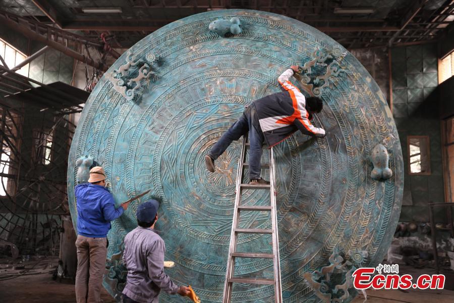 Workers create a giant bronze drum in Huanjiang Maonan Autonomous County, Southwest China’s Guangxi Zhuang Autonomous Region, Jan. 10, 2016. The drum, which is 4.2 meters in diameter, 2.6 meters tall and weighs 7 tons, was designed by two artisans who continue the Zhuang people’s traditional bronze drum casting techniques. It took six months for 20 workers to make the drum, which is said to be the world’s largest. Local authorities plan to apply for recognition in the Guinness World Records this month. (Photo/IC)