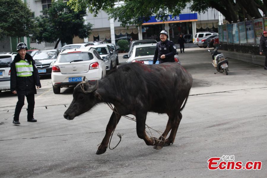 Police officers try to control a cow that runs wild in Liuzhou City, Southwest China’s Guangxi Zhuang Autonomous Region, Jan. 11, 2016. Special police fired nine shots at the animal after a length chase for about two hours because it posed a safety risk. (Photo/IC)