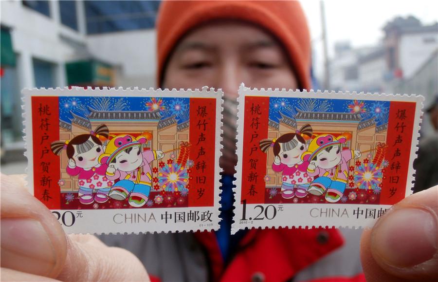 China Post issued a series of special stamps, "New Year Greetings", on Jan 10, 2016. The stamp has one piece in one set, and the nominal value is 1.2 yuan. The Chinese Year of the Monkey, or the lunar Bingshen Year, will begin on Feb 8 this year. (Photo/Asianewsphoto)