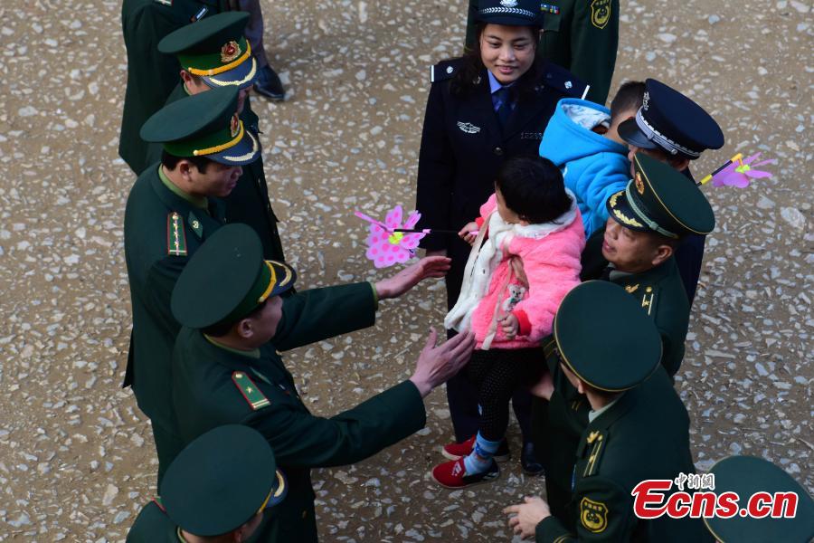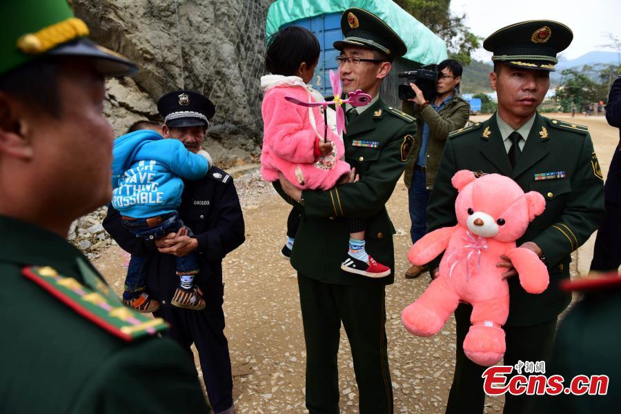 Chinese border police hand over two children, who were sold in China, to Vietnamese police at a border in Longzhou County, Southwest China’s Guangxi Zhuang Autonomous Region, Jan. 11, 2016. A long-time drug addict in Vietnam sold his own two-year-old son and four-year-old daughter to Chinese buyers in 2015 to raise money to fund his drug habit. (Photo/IC)