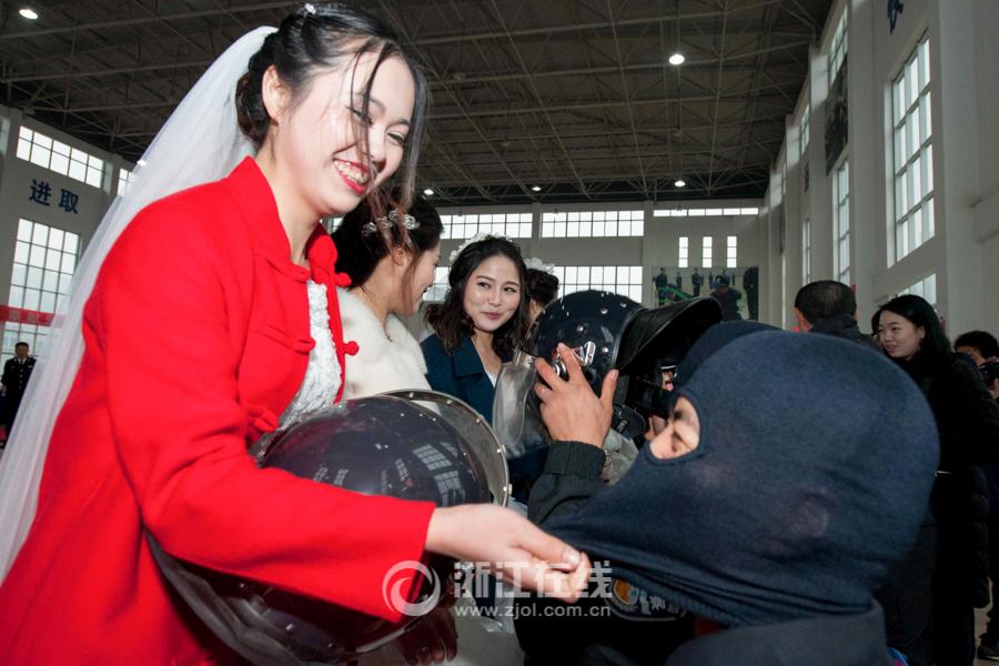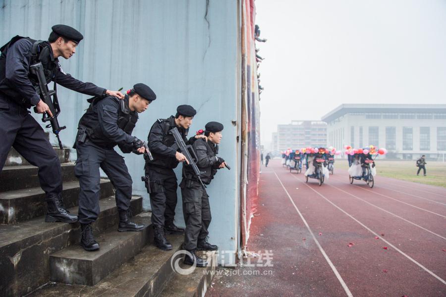Ten brides were taken by rickshaws to the training ground of the SWAT detachment of Shaoxing Public Security Bureau in Shaoxing, east China's Zhejiang city on Jan. 10, 2016. A surprising and romantic wedding was waiting for them. "We are the SWAT team of Shaoxing, please stop for inspection!" some SWAT members stopped the rickshaws. Some members descended down from the 4th floor of the building on ropes and proposed to their brides on one knee. Some controlled the UAVs to send roses to their brides. According to the SWAT team, the romantic wedding was held for 10 members of the team who had to delay the wedding due to work.