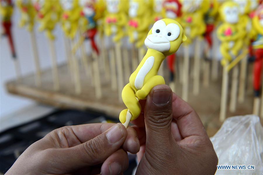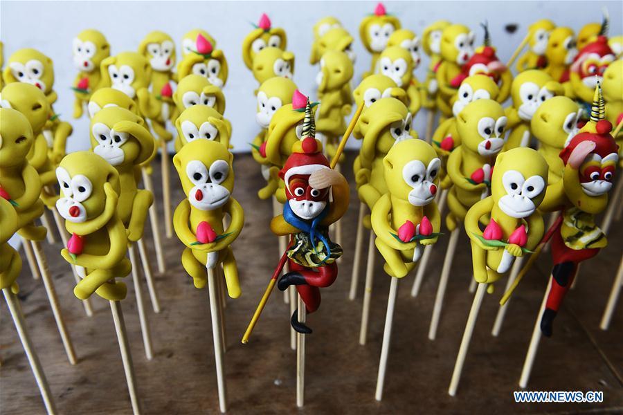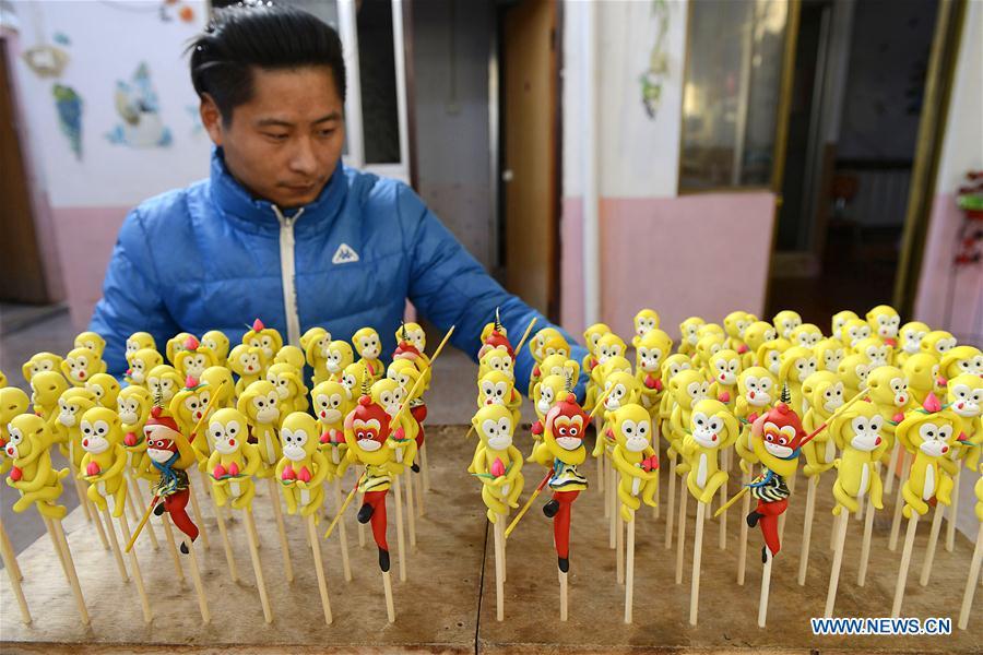 Li Jinguo, a dough modelling craftman, shows his dough figurines in Rizhao, east China's Shandong Province, Jan. 13, 2016. Li made a total of 100 monkey-shaped dough figurines to greet the upcoming Chinese lunar new year of Monkey, which begins on Feb. 8 this year. (Photo: Xinhua/Chen Weifeng)