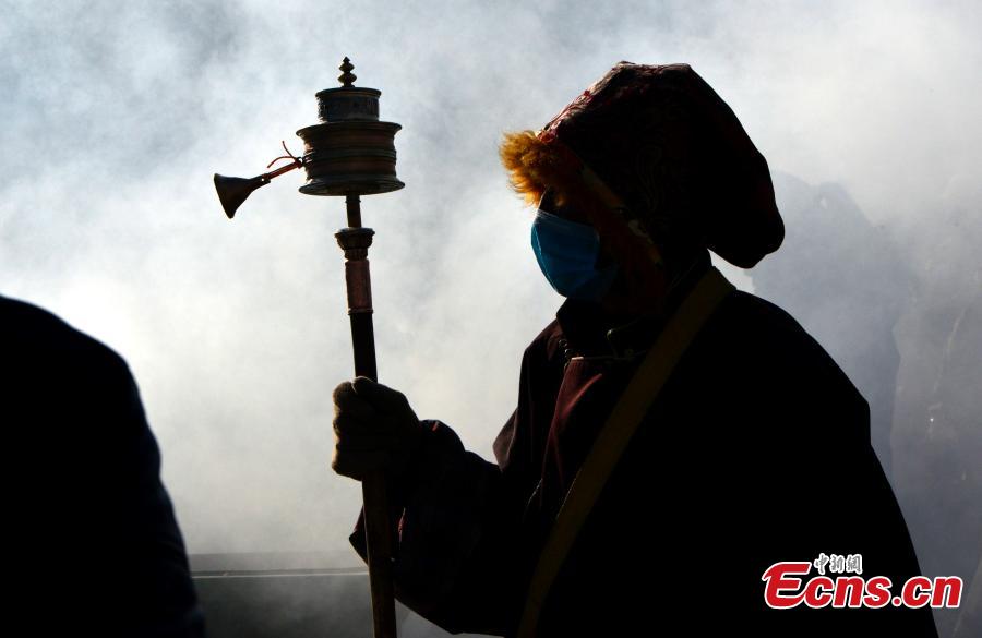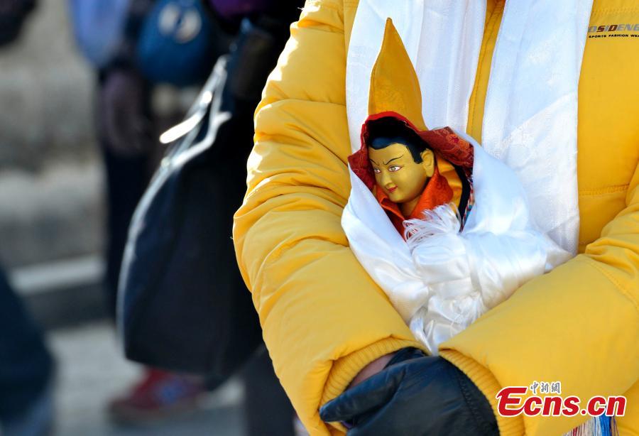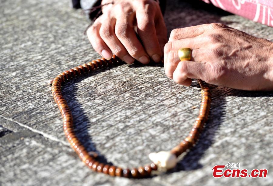 A Buddhist disciple walks around prayer wheels on Barkhor Street in Lhasa, capital city of southwest China's Tibet Autonomous Region on January 13, 2016. As the Spring Festival and the New Year on the Tibetan calendar approaching near, Buddhist disciples from all over Tibet have started their winter pilgrimages to Lhasa for pray and worship.(Photo: China News Service/ Li Lin)