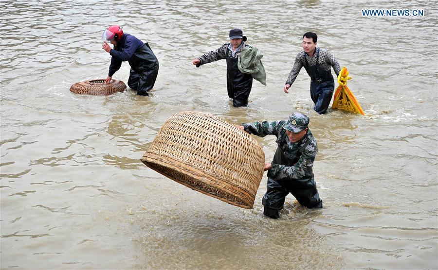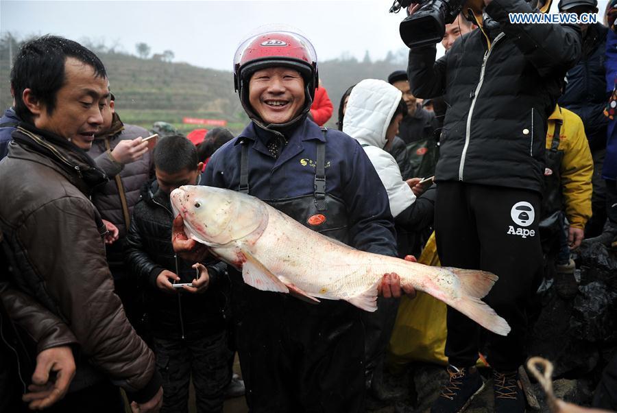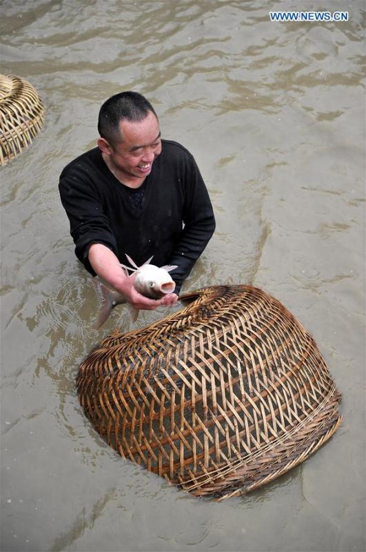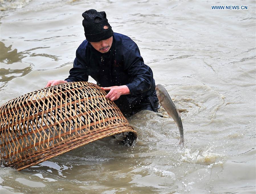 A villager catches fish at a pond in Shaziya Village, Zhangjiajie, central China's Hunan Province, Jan. 13, 2016. Local villagers held a campaign of catching fish with chicken coops on Wednesday, which is a traditional blessing activity for a harvest year. (Photo: Xinhua/Shao Ying)