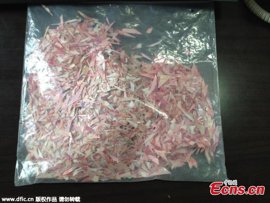 The photo shows bank notes that were cut into pieces. An 85-year-old man cut 140,000 yuan ($21,252) worth of bank notes into pieces on impulse and his son and daughter-in-law spent three months putting together 108,000 yuan in Anshan, Northeast China's Liaoning province. Chen was shocked and found each banknote was cut into dozens of pieces. He and his wife joined the pieces from 7 am to 12 am every day from October and put together 1,080 one-hundred banknotes till early January. Chen exchanged the damaged bank notes into new notes and deposited them with the remaining 60,000 yuan untouched by his father into bank in case his father cut them again.(Photo/IC)