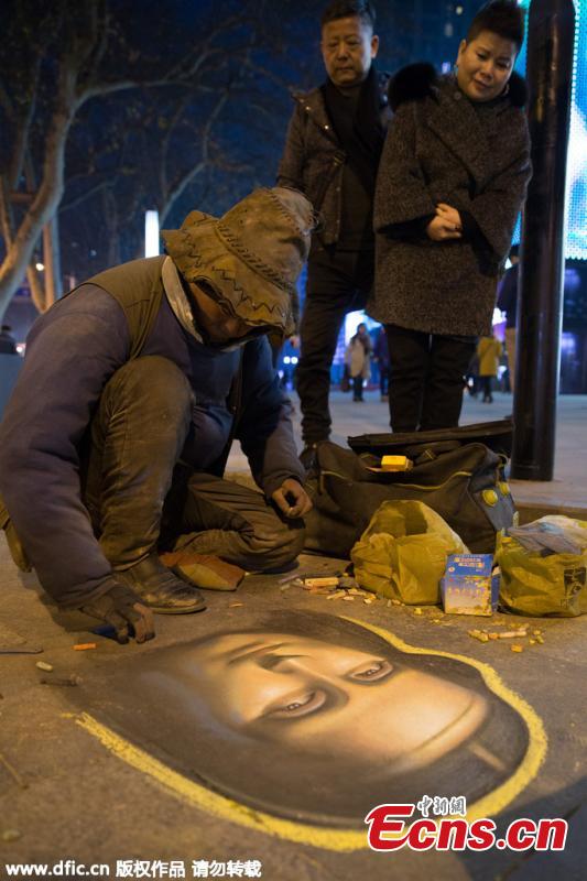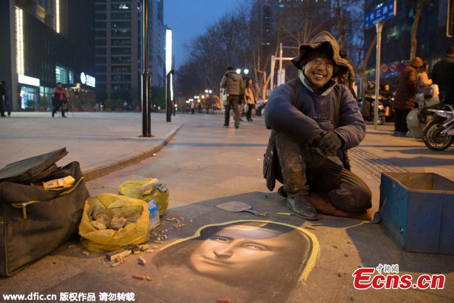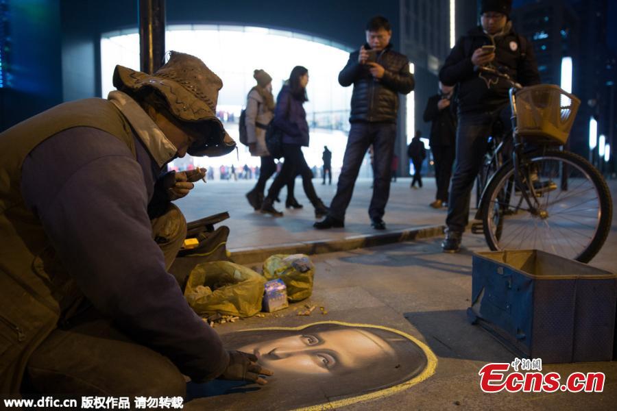An unidentified man creates a Mona Lisa portrait using colored chalk on a sidewalk in Nanjing City, the capital of East China’s Jiangsu Province, Jan. 14, 2016. The man says he learns painting by himself and lives by begging. It usually takes nine to 10 hours to finish a Mona Lisa portrait. (Photo/IC)