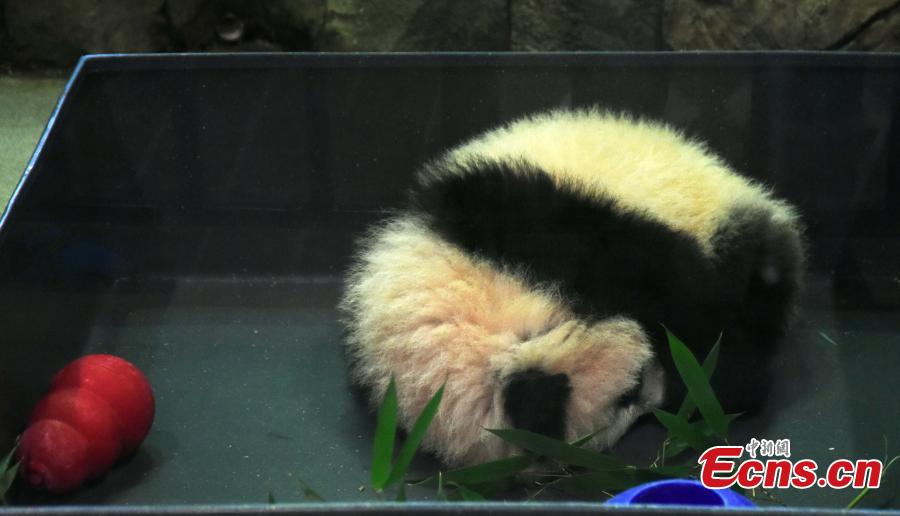 Giant panda cub Bei Bei sleeps at National Zoological Park in Washington DC, the United States, Jan 16, 2016. Born on August 22 last year, Bei Bei has been the third child of his mother, Mei Xiang and father Tian Tian. Bei Bei's weight has reached 25 pounds and started to nibble on bamboo. But he is still fed by his mother's milk, Marty Earie, a zoologist at the National Zoo, said. He has been taking care of Bei Bei since he was born. (Photo: China News Service/ Zhang Weiran)