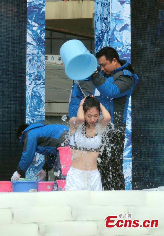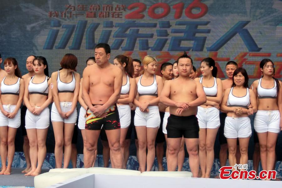 Chen Kecai (L) and Xiang Yong, two “ice men” known for their abilities to withstand extreme coldness, immerse themselves in boxes filled with ice during an event in Changsha City, the capital of Central China’s Hunan Province, Jan. 17, 2016. Chen and Xiang stayed in the box for about two and a half hours wearing nothing but swimming shorts. The charity event aimed to raise awareness of cancer and also planed to offer medical assistance to 500 patients. (Photo: China News Service/Deng Xia)