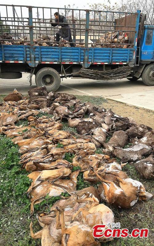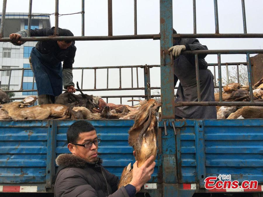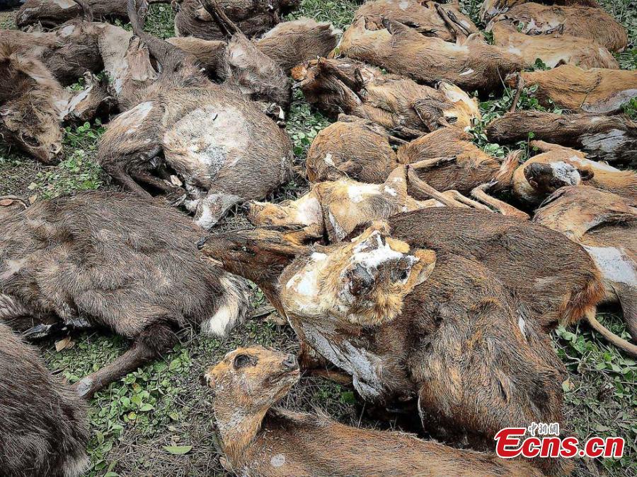 Bodies of wild animals under state protection are seized in Jiangyou, Southwest China’s Sichuan Province. A man purchased 10 tons of dead wild animals, including boar and tufted deer, to process and sell for illegal profits. The man was sentenced to three years in prison with four years of probation. (Photo/IC)