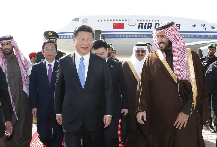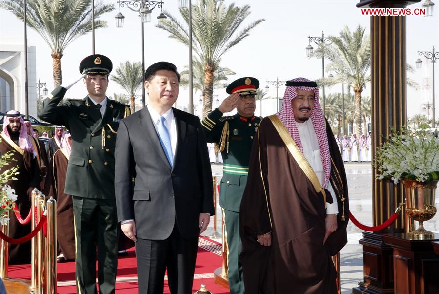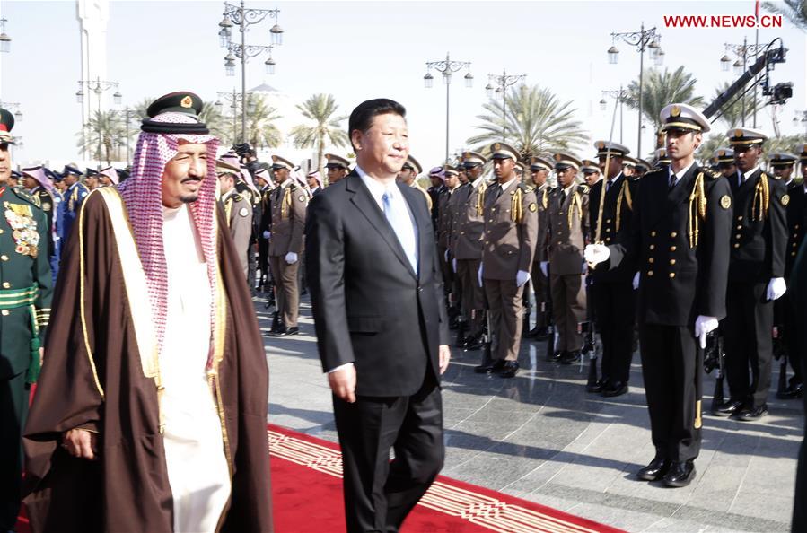 Chinese President Xi Jinping (C) attends a welcoming ceremony held by Saudi King Salman bin Abdulaziz Al Saud (L, front) for him before their talks in Riyadh, Saudi Arabia, Jan. 19, 2016. Xi arrived here on Tuesday for a state visit to Saudi Arabia, the first stop of his three-nation tour of the Middle East. (Phoot: Xinhua/Ju Peng)