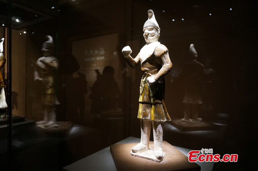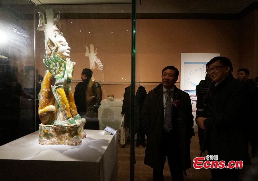 Tangcancai, tri-colored glazed pottery works of the Tang Dynasty, are on display at the Henan Museum in Zhengzhou City, the capital of Central China’s Henan Province, Jan. 19, 2016. The Taipei-based National Museum of History presented 10 sets of tri-colored glazed pottery works together with collections from the Henan Museum in the joint exhibition, the first such kind of exchange across the Taiwan Straits in 66 years. Sancai, or tri-colored pottery, was the magnificent flagship ceramic ware of the Tang Dynasty (618-907). (Photo: China News Service/Zhou Xiaoyun)