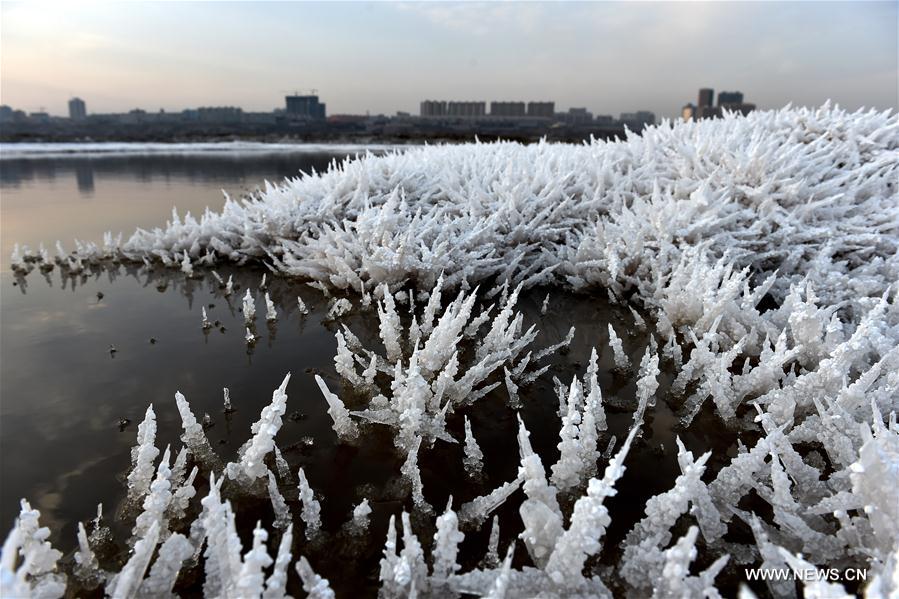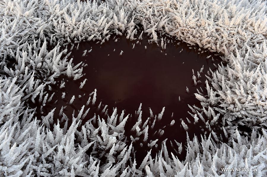Photo taken on Jan. 19, 2016 shows the scenery of mirabilite rime on the Salt Lake in Yuncheng, north China's Shanxi Province. Mirabilite rime is formed when mirabilite crystalizes at a low temperature. The Salt Lake of Yuncheng, a typical inland saltwater lake, is the world's third largest sodium sulphate inland lake. Due to its high saltness, it is also called the "Dead Sea" of China. (Photo: Xinhua/Zhan Yan)