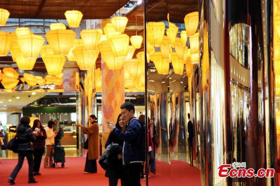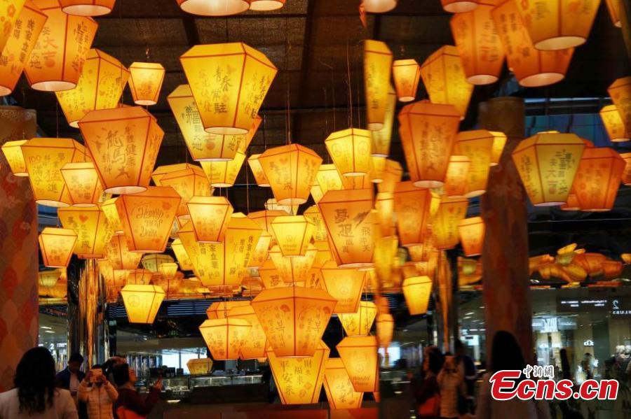 Sky lanterns are on display to celebrate the upcoming Spring Festival, China’s Lunar New Year, in Taikoo Shing, Hong Kong, Jan. 21, 2016. (Photo: China News Service/Hong Shaokui)