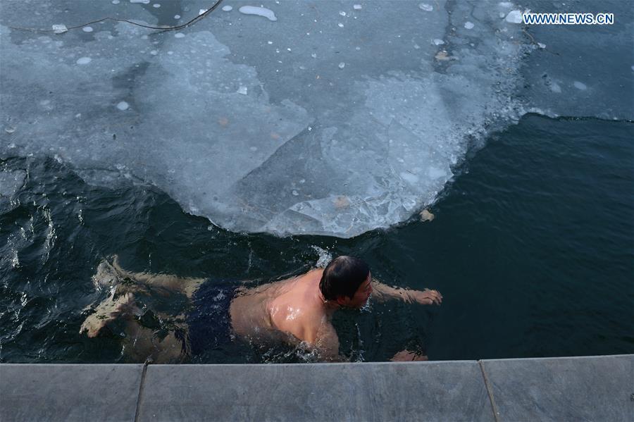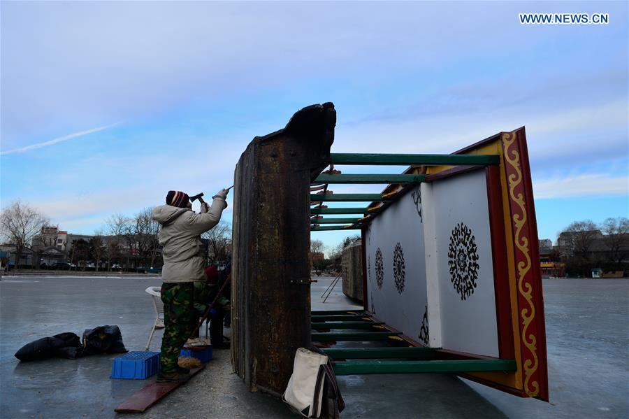 Workers check and maintain the ice on the ice-covered Shichahai lake, a scenic spot in Beijing, capital of China, Jan. 22, 2016. Temperature in Beijing is expected to hit a 30-year low of minus 17 degrees Celsius on Saturday, Beijing meteorological station forecasted. (Photo: Xinhua/Yin Dongxun)