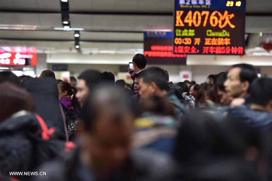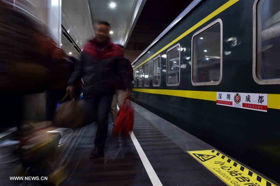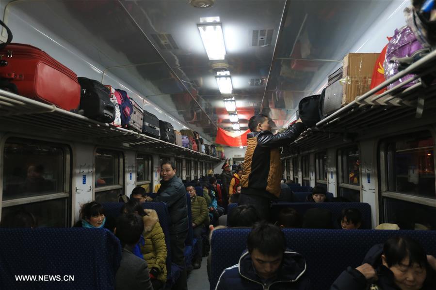 Passengers arrange their luggage on a train heading from China's capital Beijing to southwest China's Chongqing, Jan. 24, 2016. Over 2.9 billion trips will be made around China during the 40-day Spring Festival travel rush, which kicked off Sunday, traffic police authorities estimated. Spring Festival, China's most important holiday centering around family reunions, will fall on Feb. 8. (Xinhua/Xing Guangli)