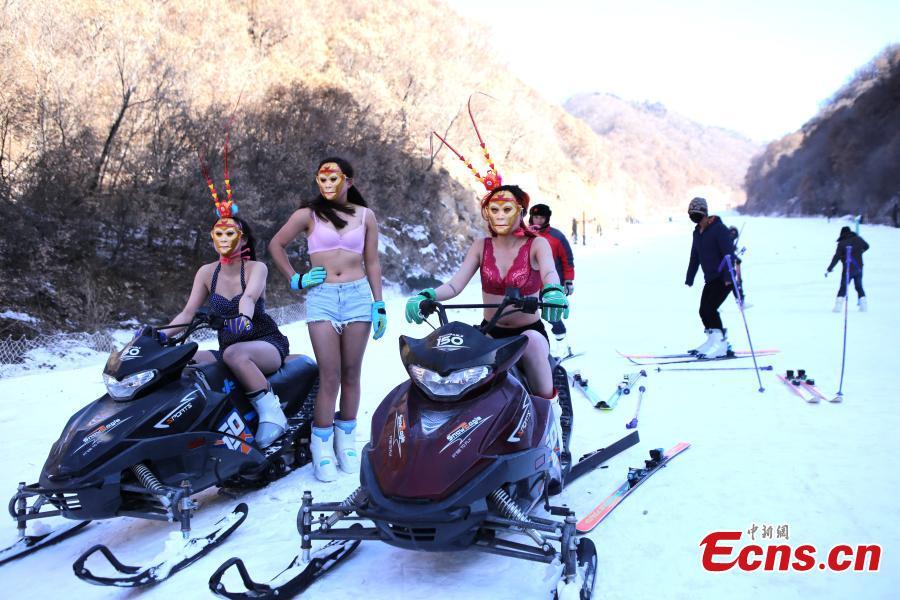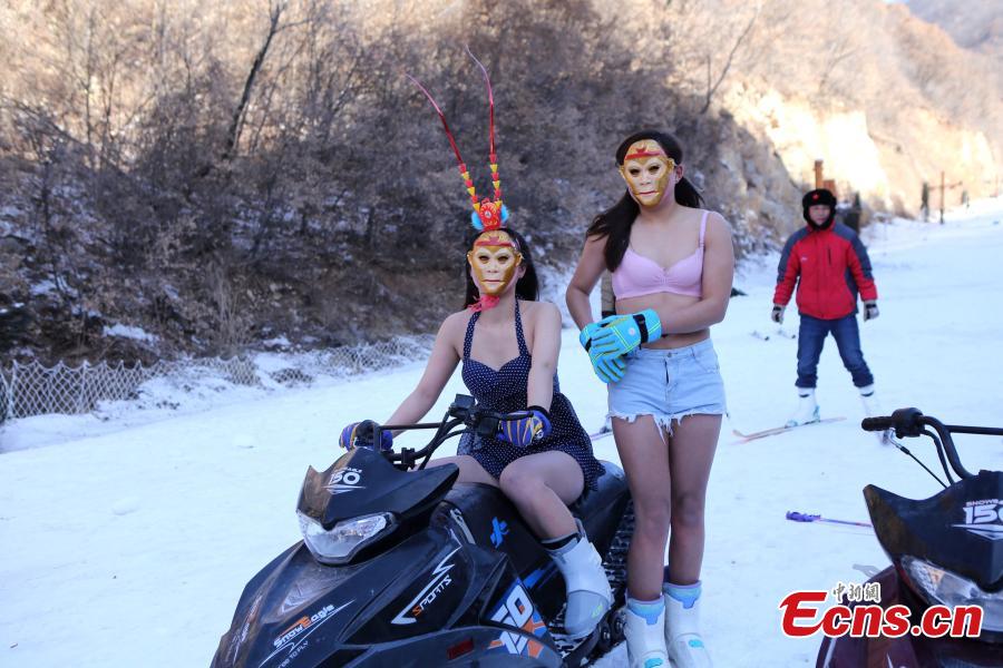 Swimsuit-clad models pose wearing monkey masks at an event to promote a ski resort in Sanmenxia, Central China’s Hennan Province, Jan. 24, 2016. Temperatures dropped to minus 15 degrees Celsius during the event. In the Chinese lunar calendar, 2016 is the Year of the Monkey. (Photo: China News Service/Wang Zhongju)