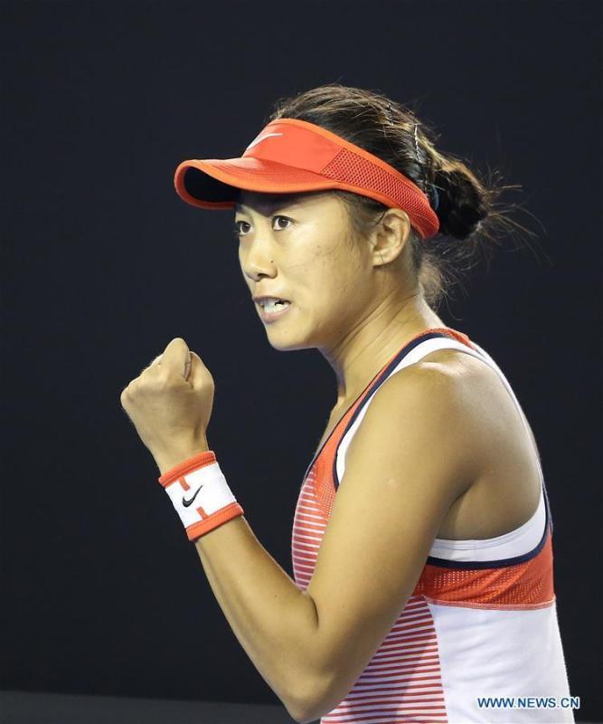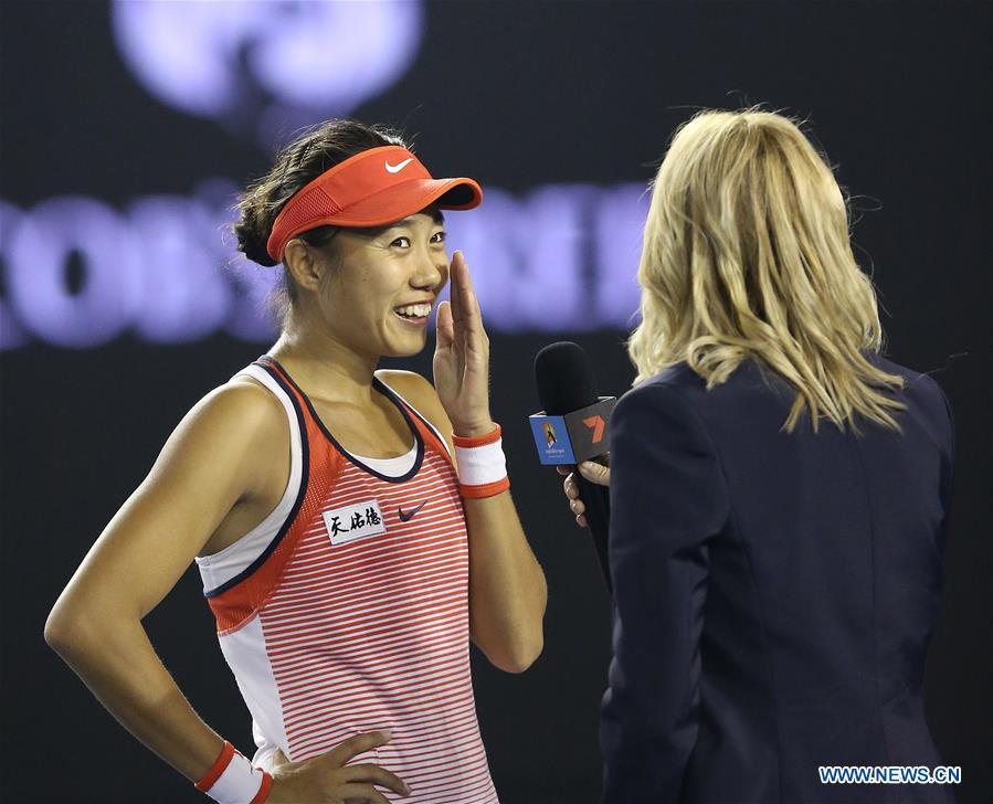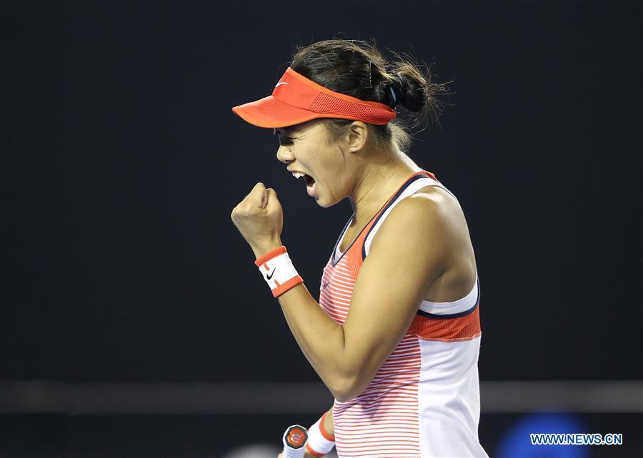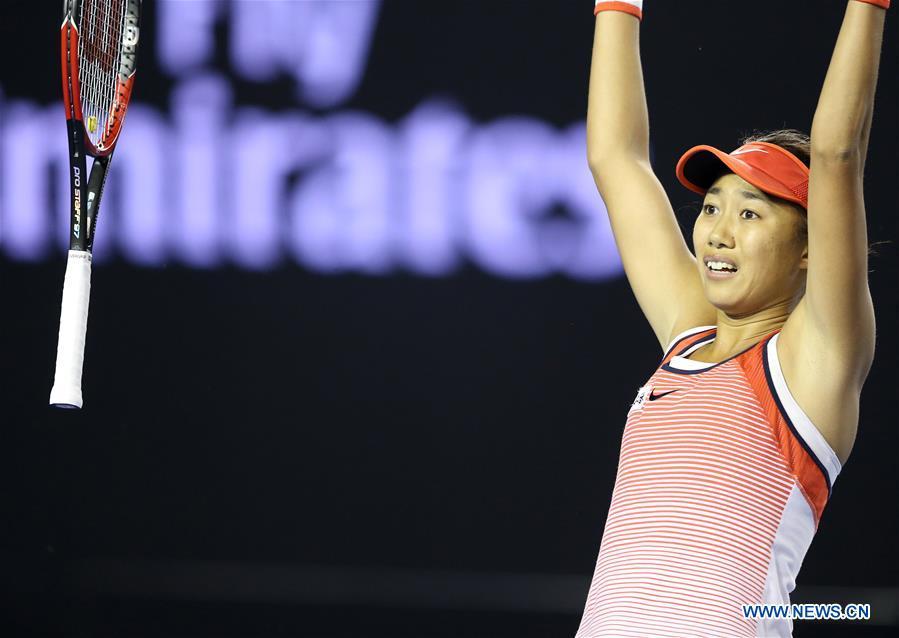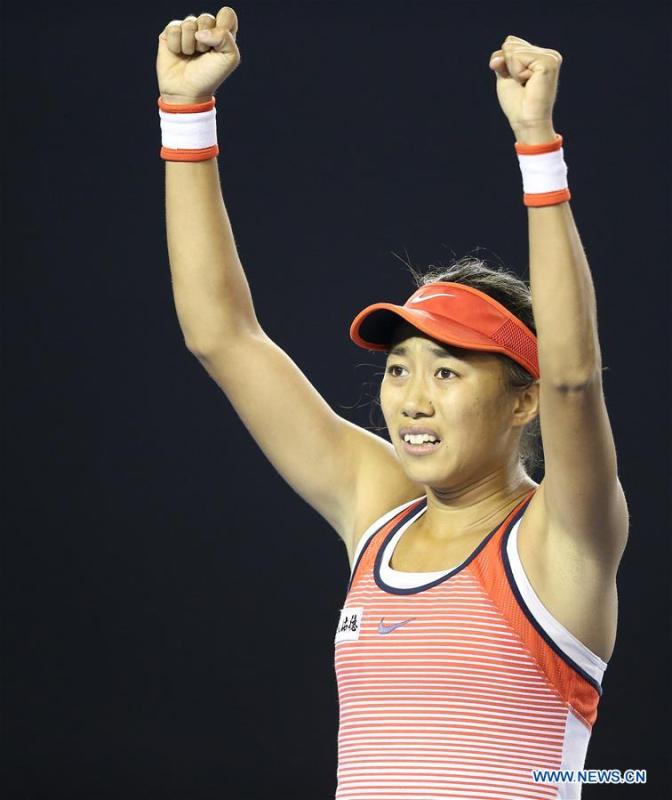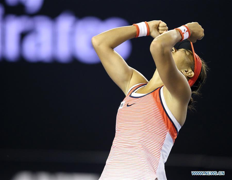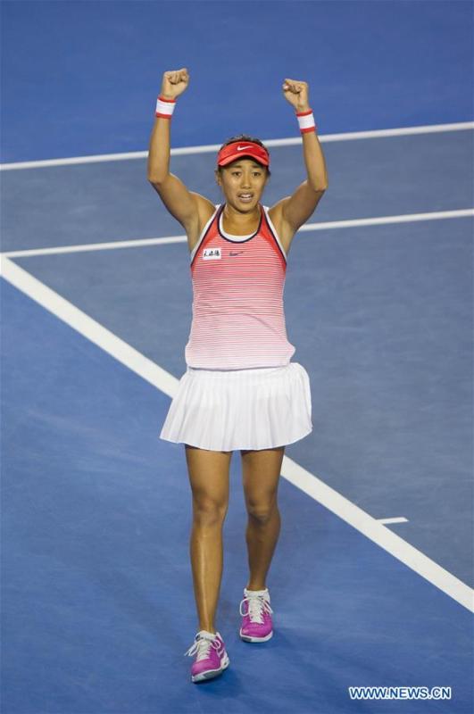 China's Zhang Shuai reacts after winning the 4th round match of women's singles against Madison Keys of the United States at the Australian Open Tennis Championships in Melbourne, Australia, Jan. 25, 2016. Zhang Shuai entered the Australian Open women's singles quarterfinals here Monday. (Xinhua/Bi Mingming)
