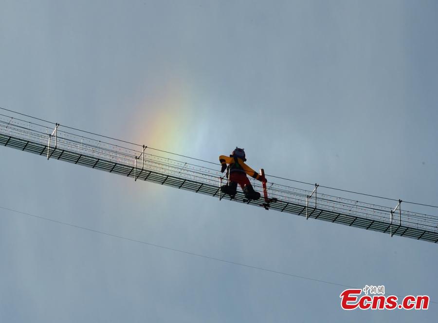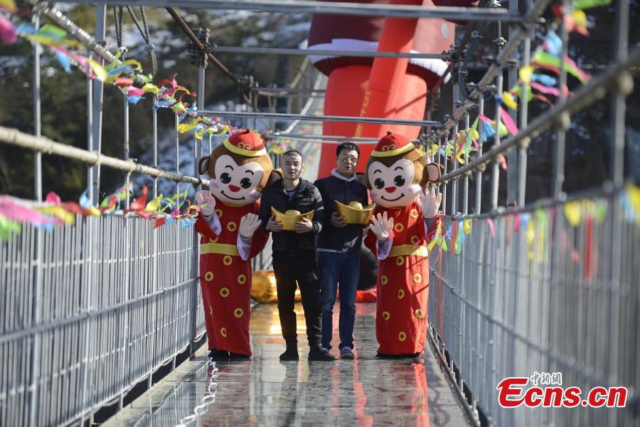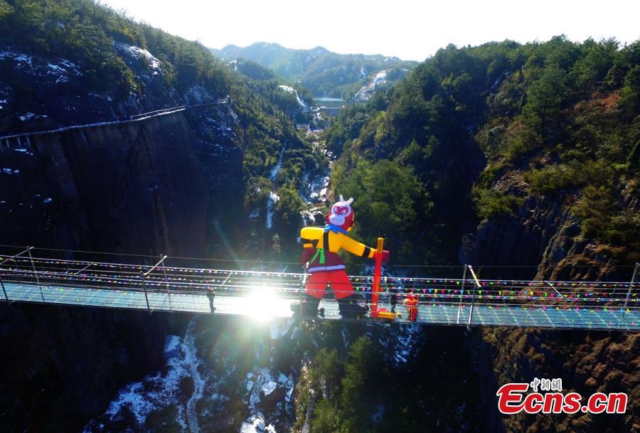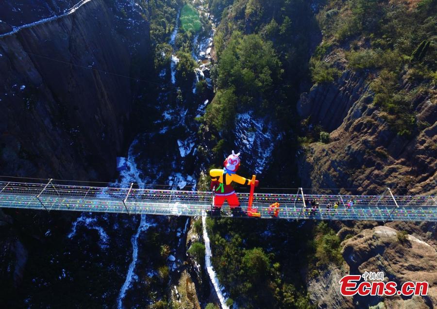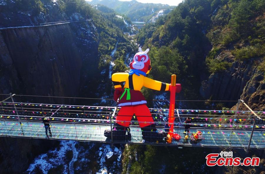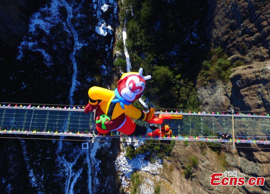 An inflatable, 10-meter-tall Monkey King decoration is erected on the glass floor of a suspension bridge, 180 meters above ground, in Shiniuzhai scenic spot, Pingjiang County, Central China’s Hunan Province, Jan. 25, 2016. According to Chinese lunar calendar, 2016 is the Year of the Monkey. Sun Wukong, also known as the Monkey King, is a main character in the Chinese classical novel "Journey to the West". (Photo: China News Service/Yang Huafeng)