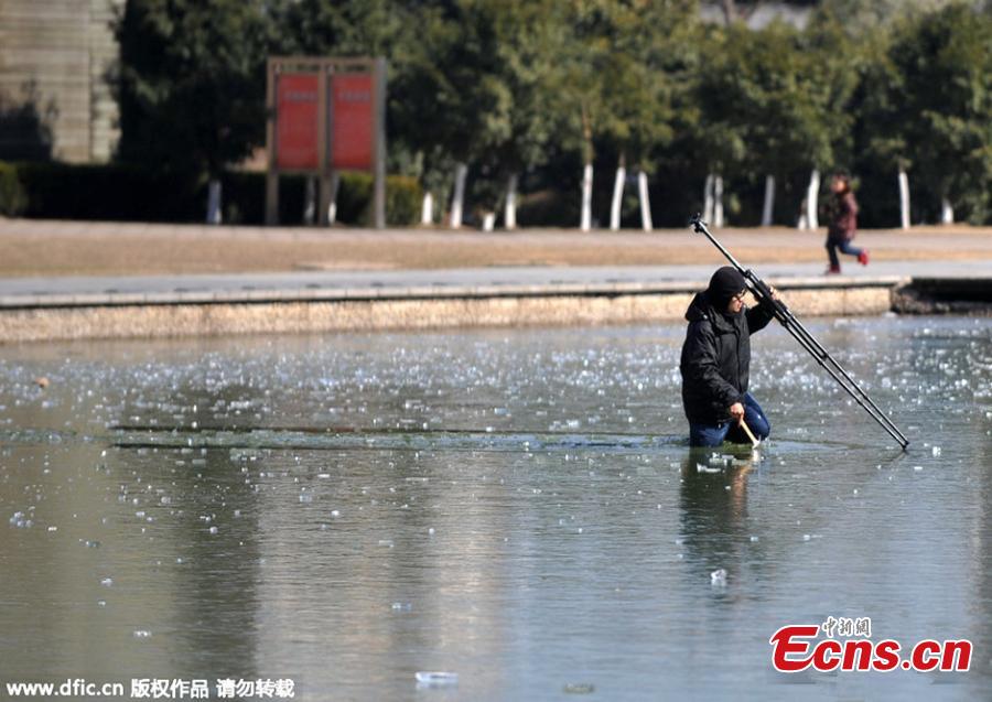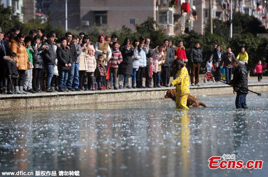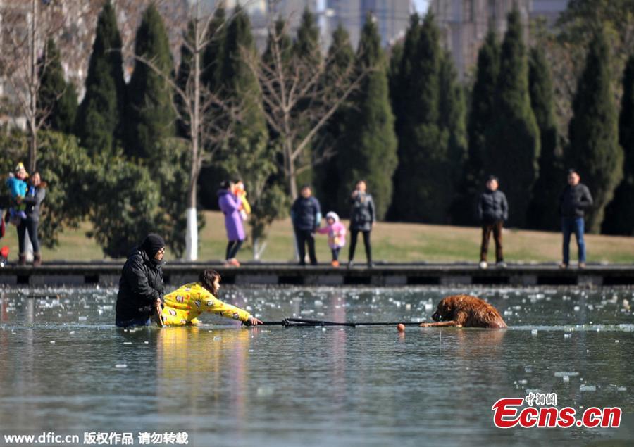 A dog is stranded in a frozen lake in Hefei City, the capital of East China’s Anhui Province, Jan. 25, 2016. The dog was later rescued by a man who used his camera tripod to break the ice.(Photo/IC)