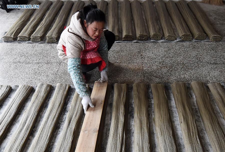 A villager prepares sweet potato vermicelli in Xinjie township, Guanyang county, Southwest China's Guangxi Zhuang autonomous region, Jan 26, 2016. Villagers in Guanyang are busy in making sweet potato vermicelli to meet the demand of the market for the upcoming Chinese Lunar New Year, or the Spring Festival, which falls on Feb 8 this year.(Photo/Xinhua)