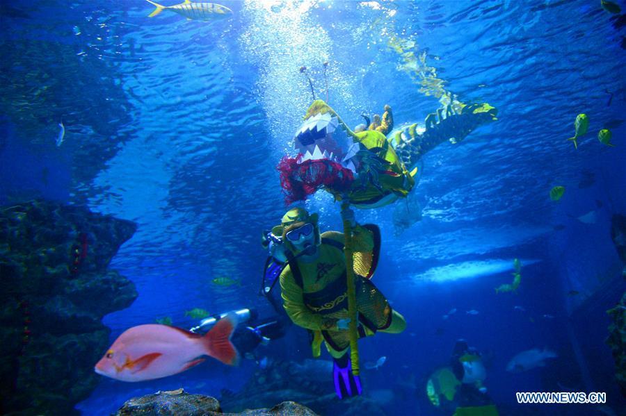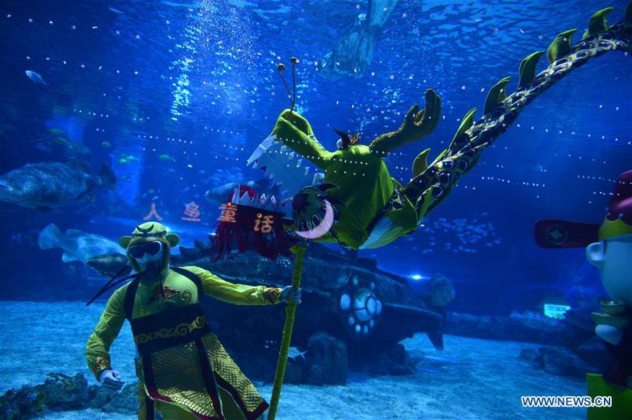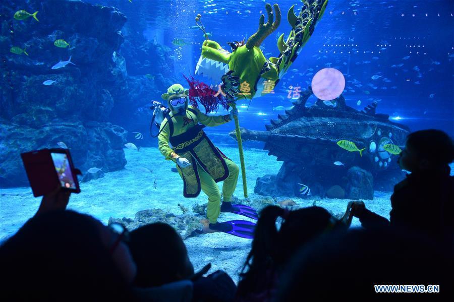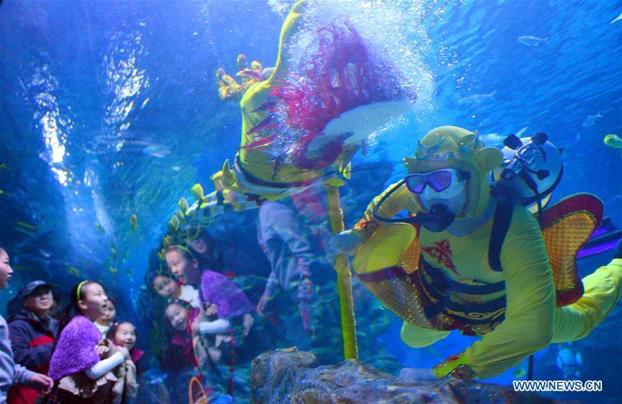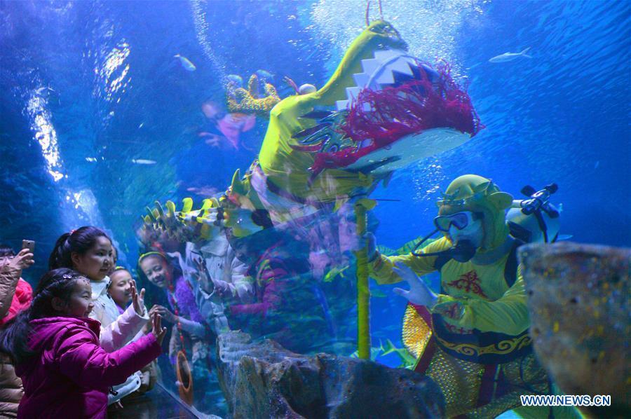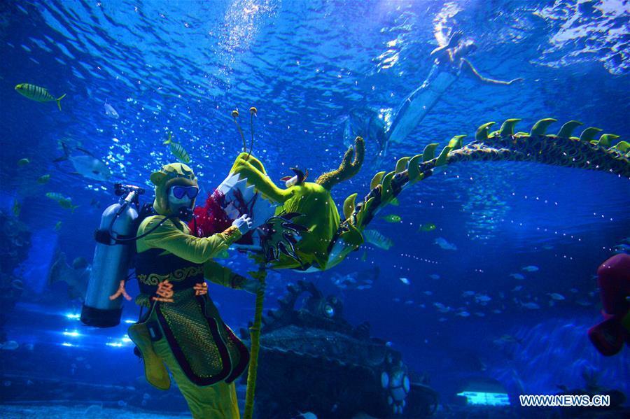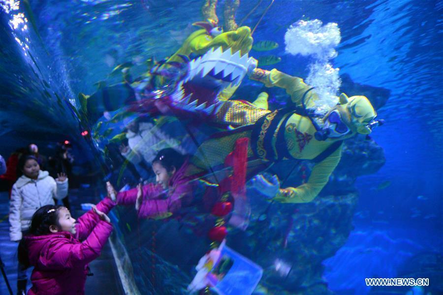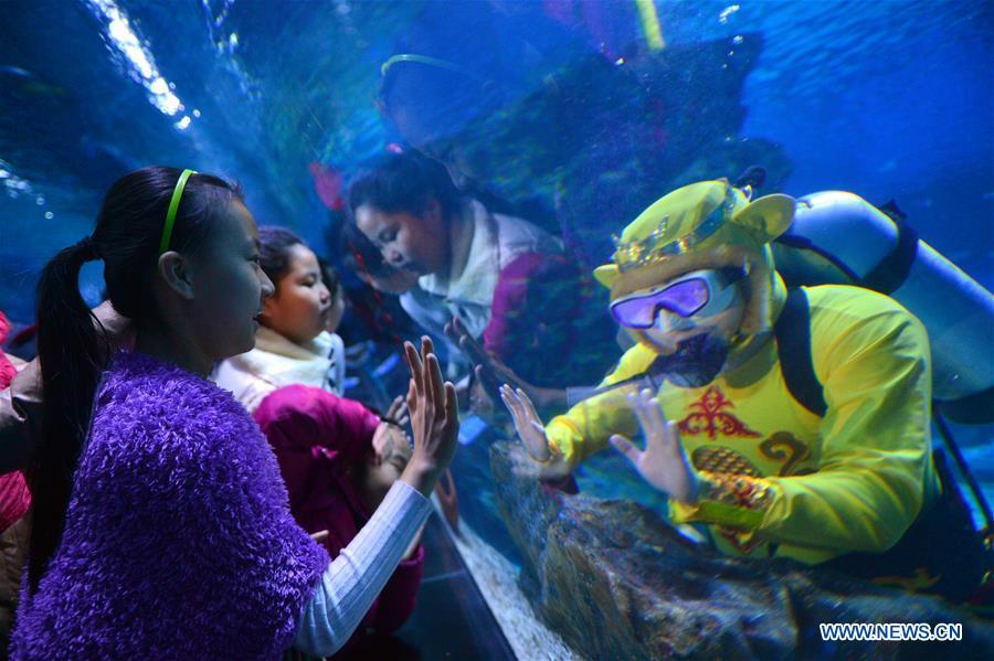 A diver with the costume of "Sun Wukong", the Monkey King in the Chinese classical novel "A Pilgrimage to the West", interacts with tourists at the Haichang Polar Ocean World in Tianjin, north China, Jan. 28, 2016, to celebrate the upcoming Chinese Spring Festival. (Xinhua/You Sixing)