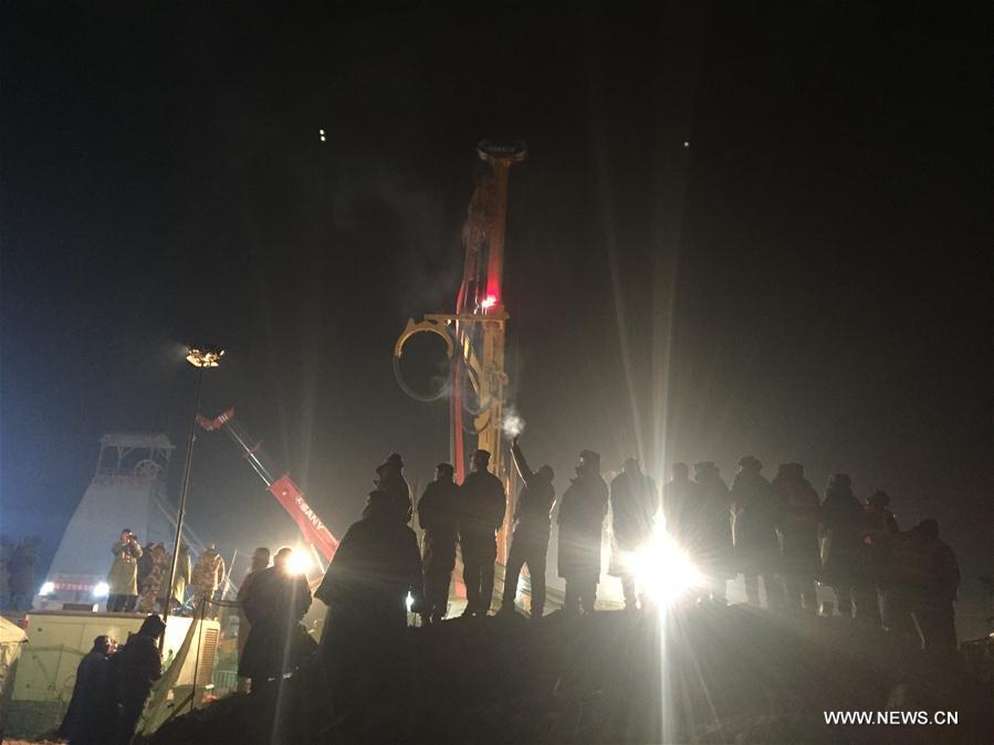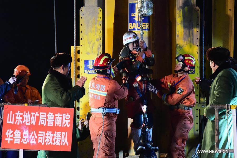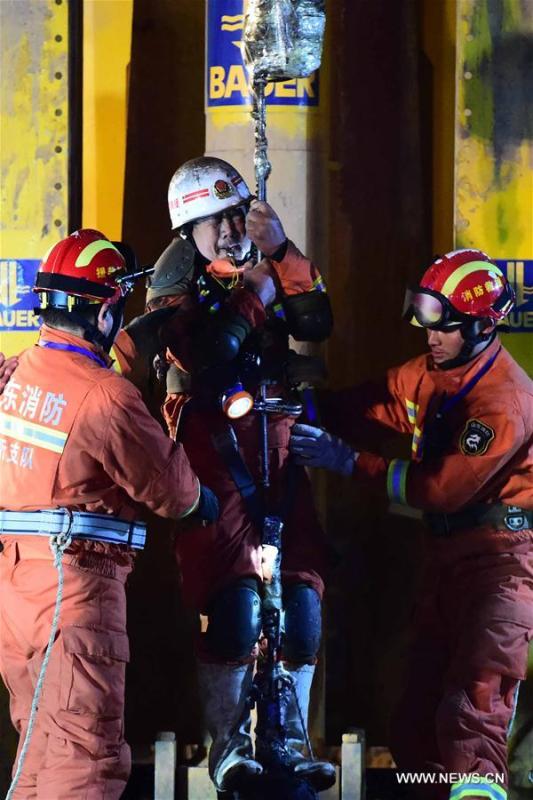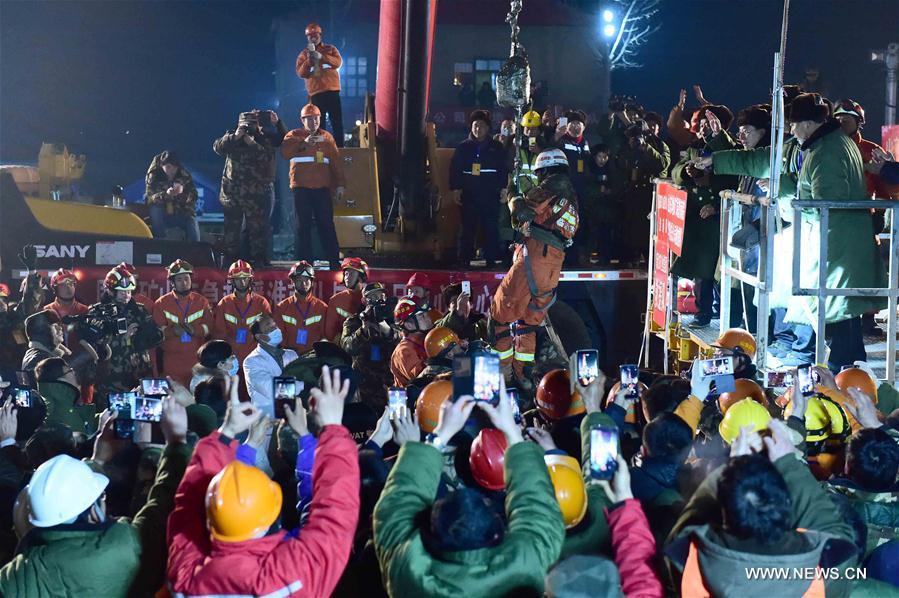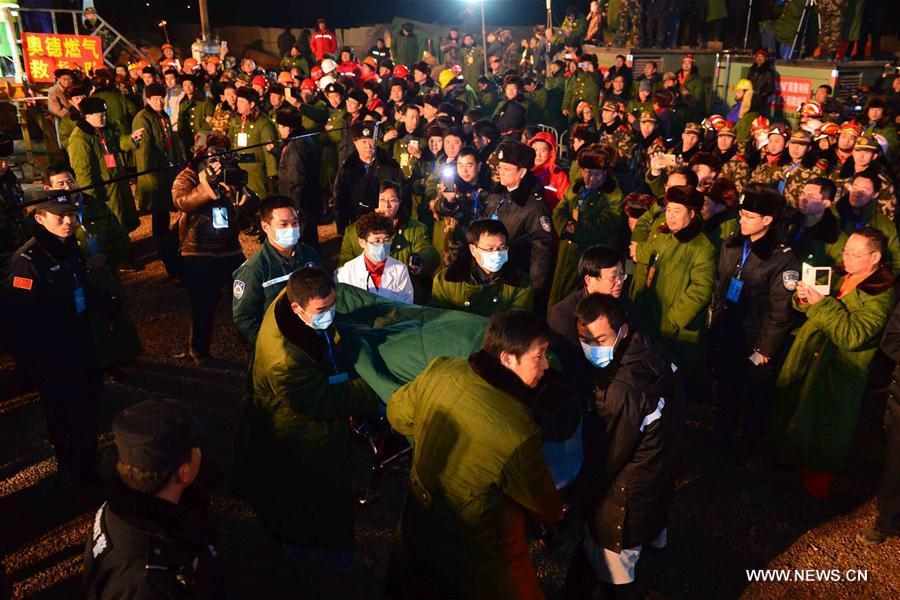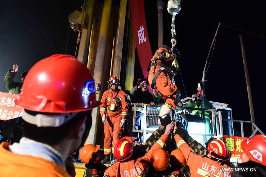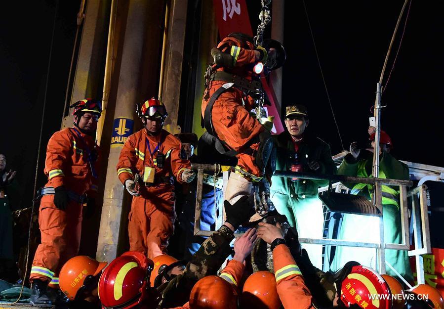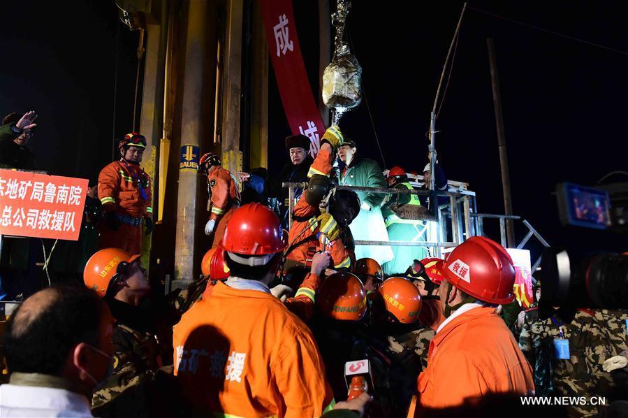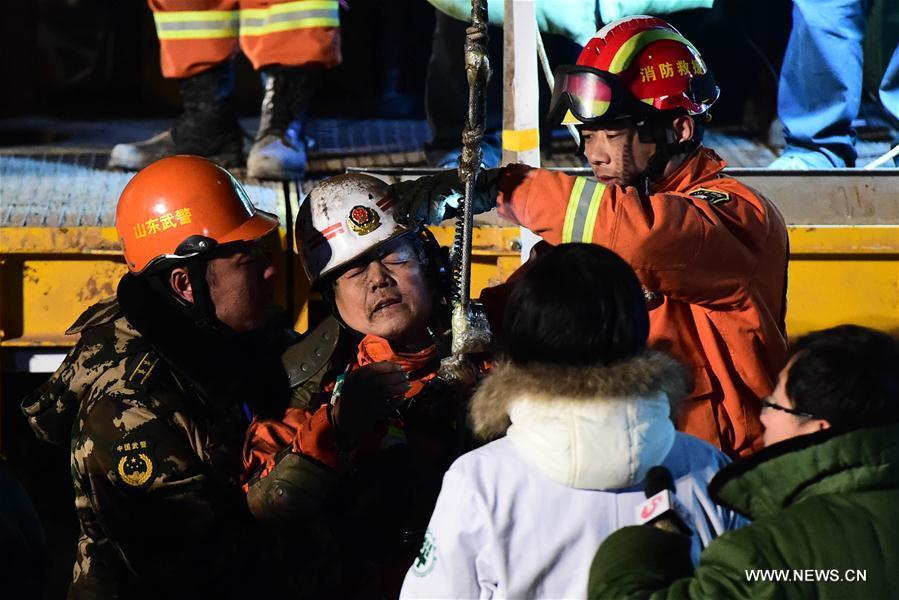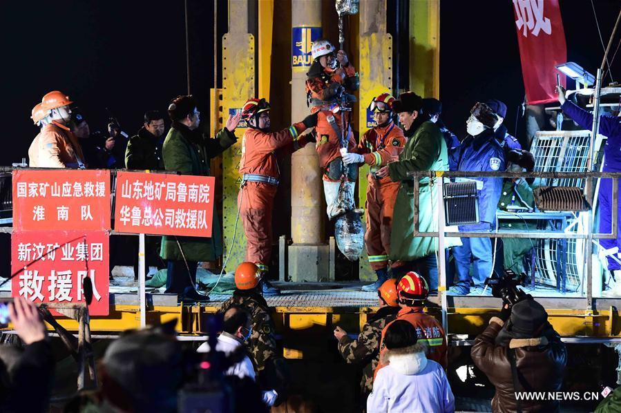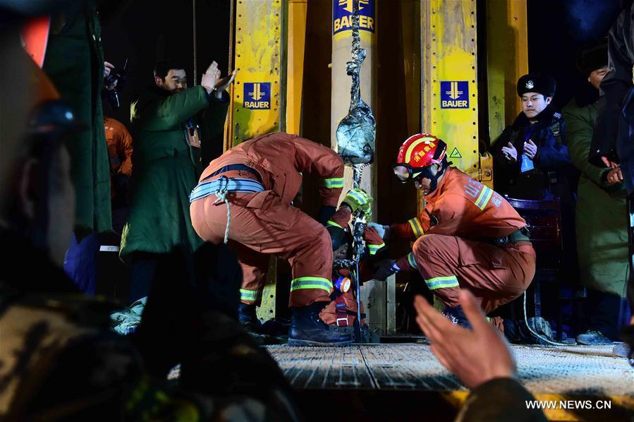The first miner is lifted from a collapsed mine in Pingyi, east China's Shandong Province, Jan. 29, 2016. Two workers were lifted from a collapsed mine in Shandong on Friday night after spending 36 days trapped underground. (Photo: Xinhua/Guo Xulei)