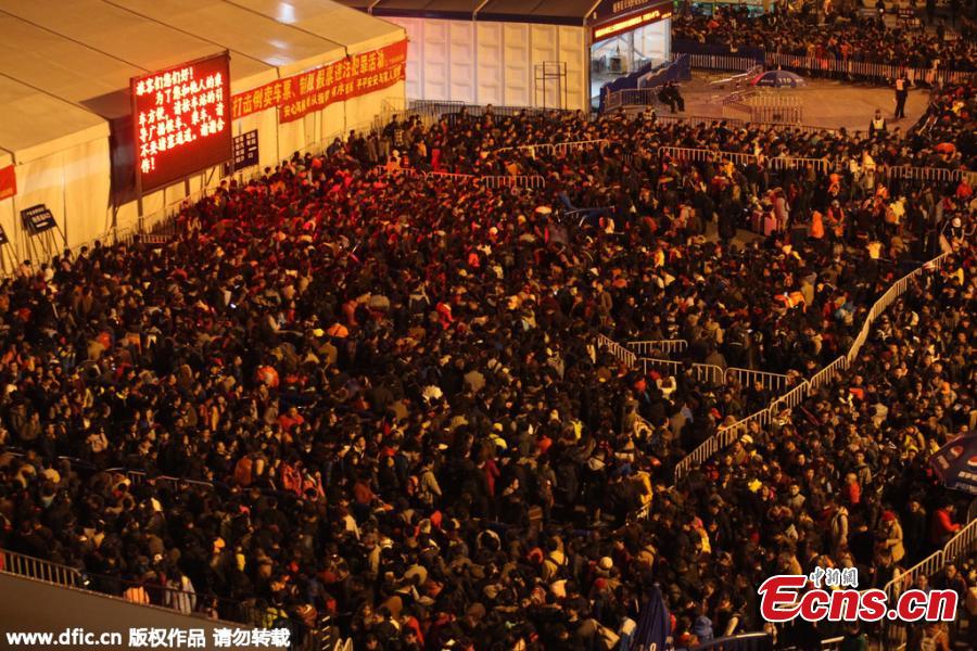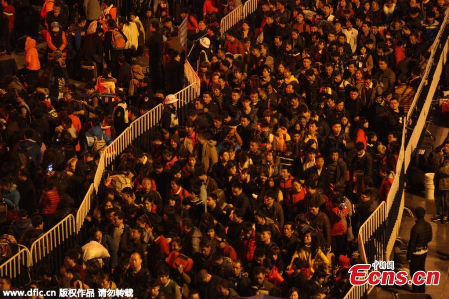 Frustrated passengers are stranded in the waiting hall at a railway station in Guangzhou, South China’s Guangdong province after several trains were delayed due to equipment failure and bad weather condition on February 1, 2016.(Photo/IC)