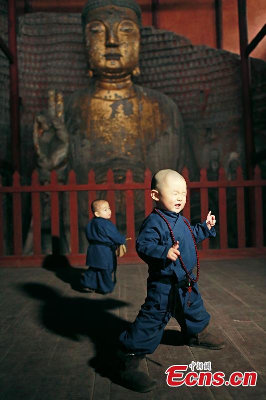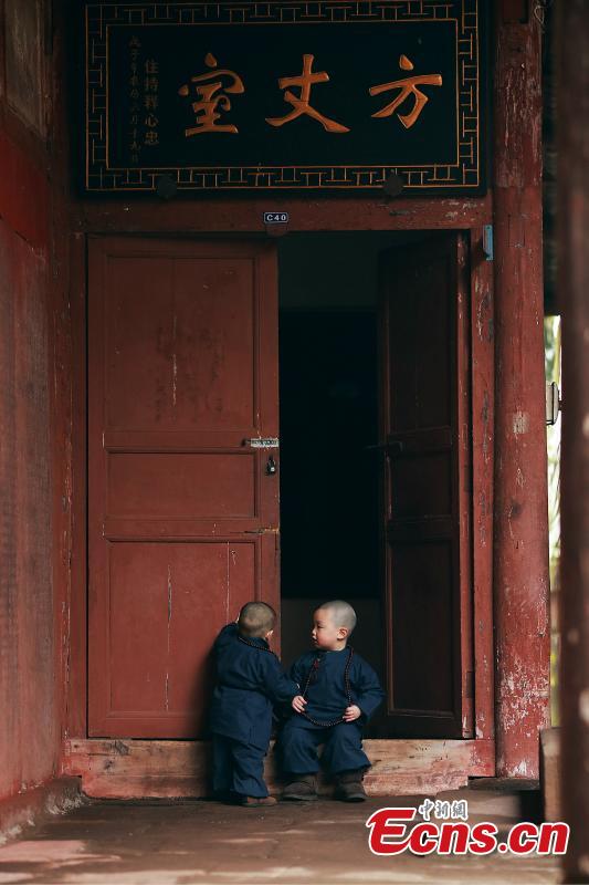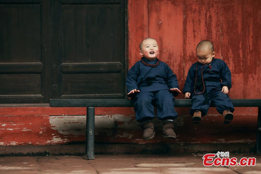 Two children pose for photos at a temple in Southwest China’s Chongqing Municipality. The photos of the cute boys in monk costume went viral on the Chinese Internet after the local tourism authority shared them on microblogging site. (Photo: China News Service/Zhong Xin)