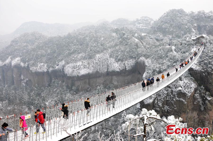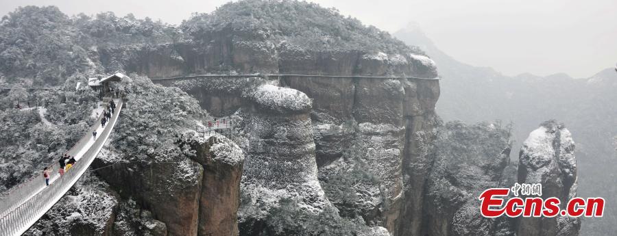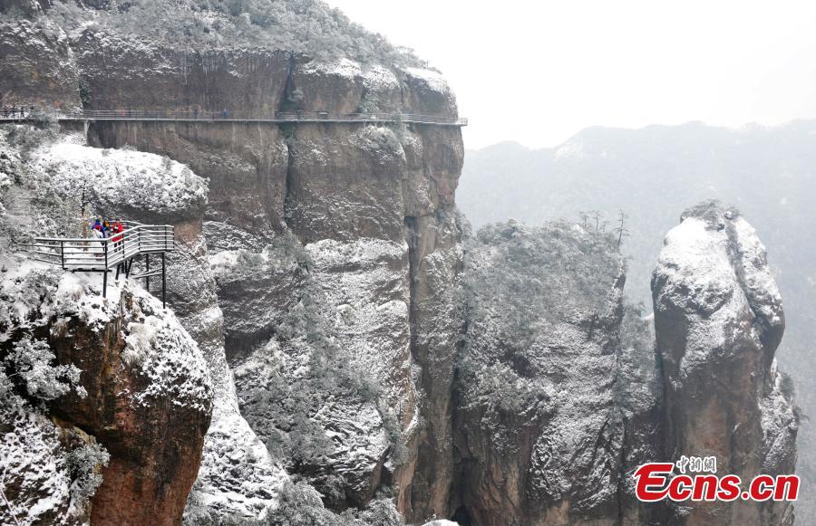 This photo taken on Feb. 2, 2016 shows the snow-covered Shenxianju scenic spot in Xianju County, East China’s Zhejiang Province. Shenxianju, which literally means a dwelling for immortals, is a popular tourist attraction, awarded a 5A rating, China's top classification for scenic spots. Many tourists think Shenxianju after a snowfall looks like a classical Chinese ink painting. (Photo: China News Service/Wang Huabin)