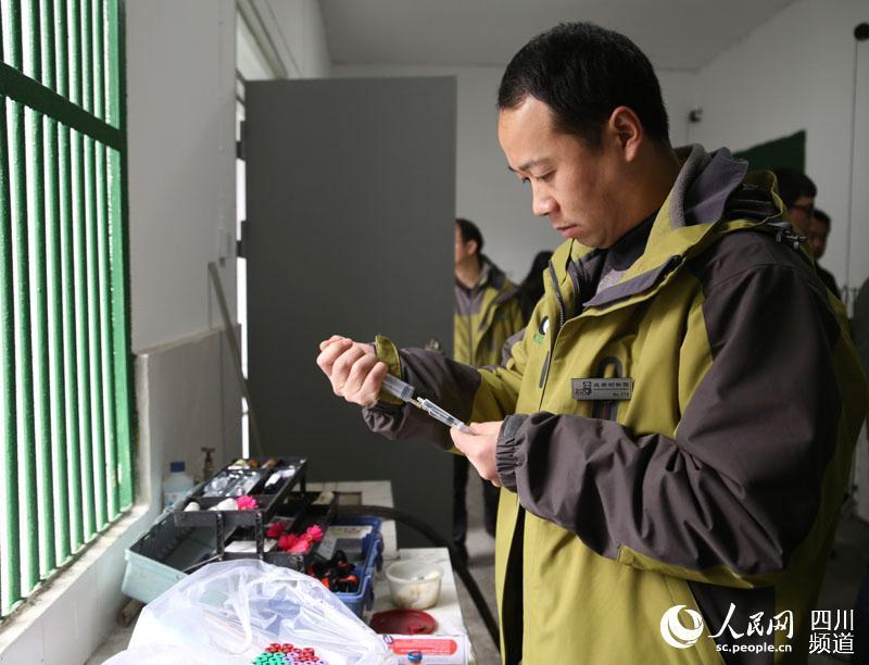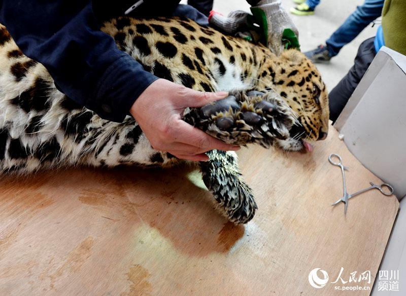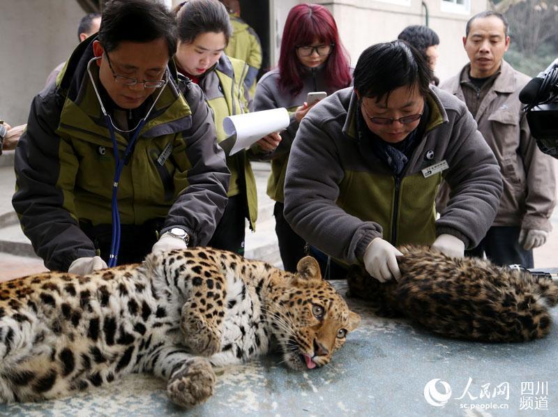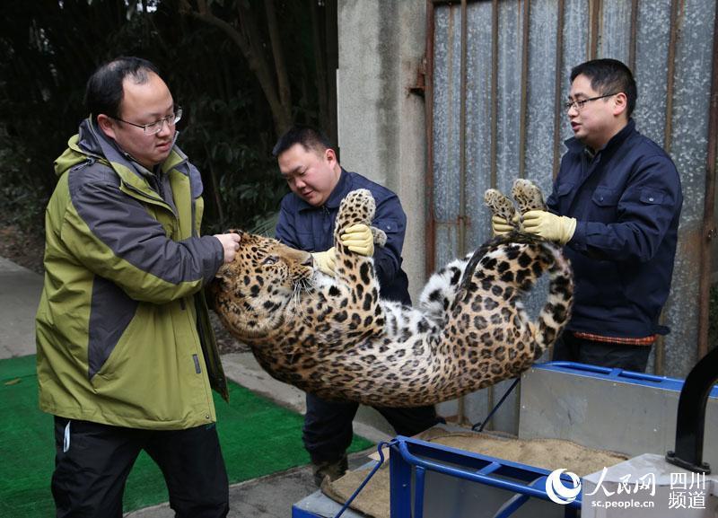 An anesthetized leopard is carried to a new room at a zoo in Chengdu city, the capital of Southwest China’s Sichuan Province, Feb. 2, 2016. Rooms at the zoo have been freshly renovated for 19 leopards. (Photo/people.cn)