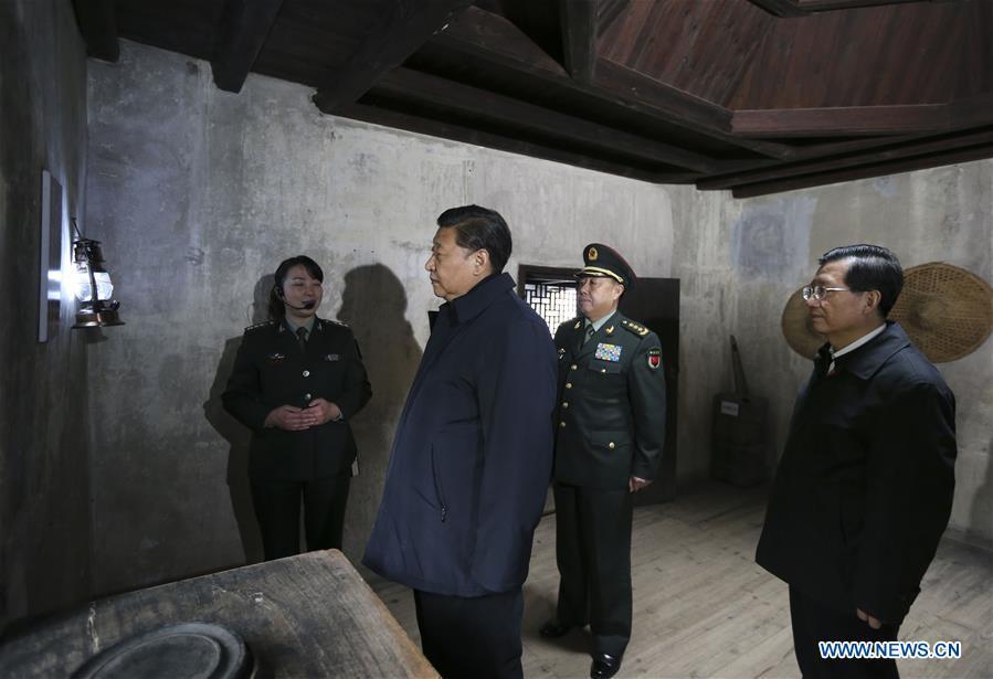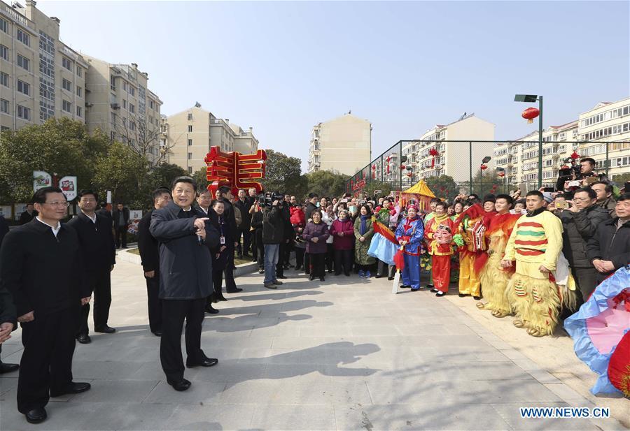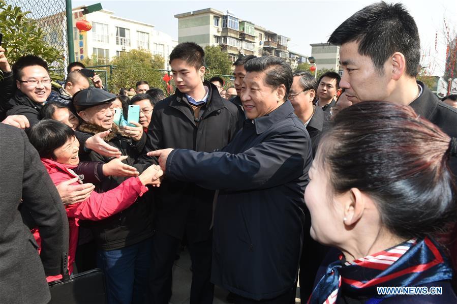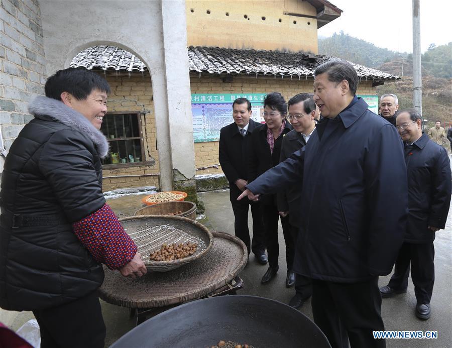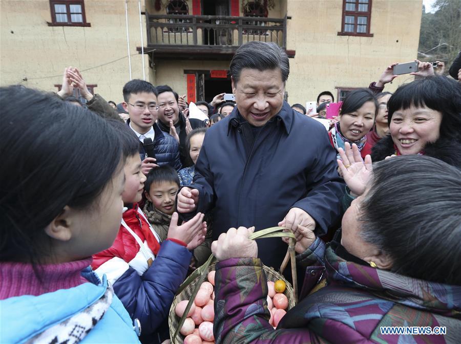 Chinese President Xi Jinping (R, front), also general secretary of the Communist Party of China (CPC) Central Committee and chairman of the Central Military Commission, talks with villagers while visiting revolutionary site in Jinggangshan, east China's Jiangxi Province, Feb. 2, 2016. Xi extended holiday greetings to all Chinese citizens and military personnel during a three-day tour in Jiangxi from Feb. 1 to 3. (Photo: Xinhua/Lan Hongguang)