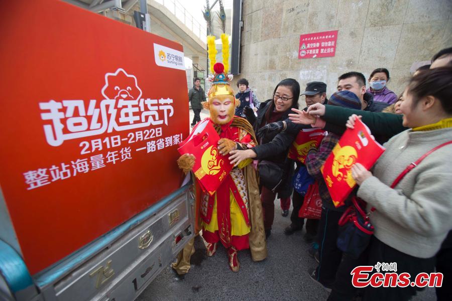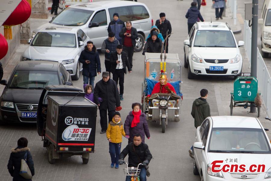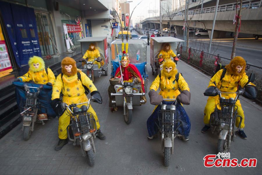 Deliverymen dressed as Monkey King deliver goods in Taiyuan City, the capital of North China’s Shanxi Province, Feb. 3, 2012. Monkey King is a main character in the Chinese classical novel Journey to the West. An e-commerce site organized the acidity before the Spring Festival, China’s Lunar New Year. According to China’s lunar calendar, 2016 is the Year of the Monkey. (Photo: China News Service/Zhang Yun)