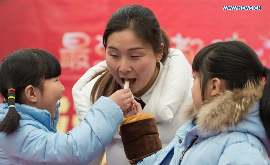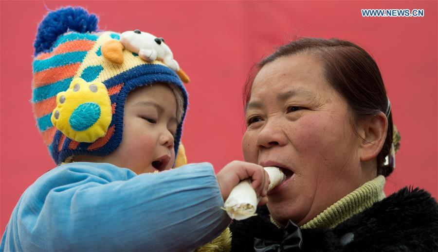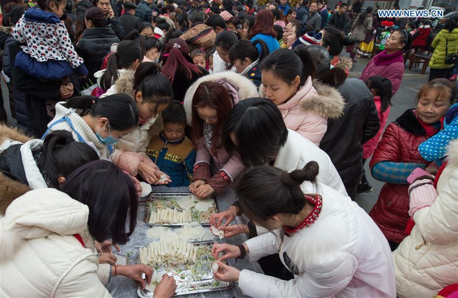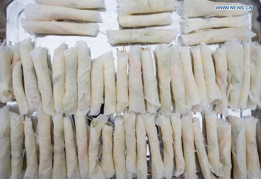 Photo taken on Feb. 3, 2016 shows "spring roll", a thin sheet of dough, rolled, stuffed and fried, at a food fair in Chengdu, southwest China's Sichuan Province. To make and taste spring rolls with parents is part of Chinese traditions in celebration of the day of "Lichun", literally meaning the beginning of spring, which falls on Feb. 4 this year. (Photo: Xinhua/Jiang Hongjing)