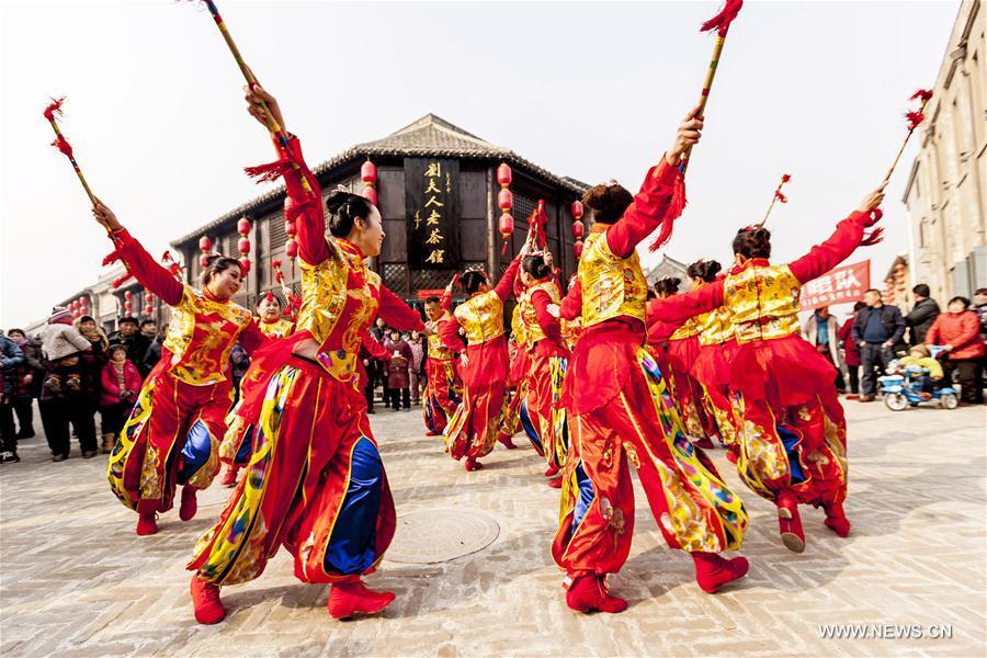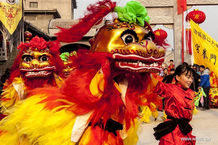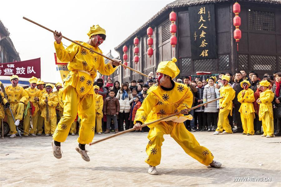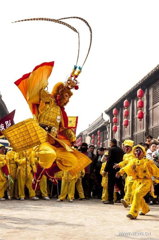 Young actors in Monkey King costumes perform traditional folk play to celebrate the upcoming Spring Festival, or the Chinese Lunar New Year, in Anyang, central China's Henan Province, Feb. 4, 2016. (Xinhua/Wang Zirui)