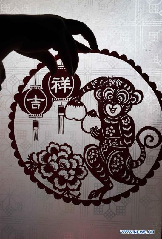 A folk artist demonstrates an artwork of paper-cutting of monkey in Nantong, east China's Jiangxi Province, Feb. 5, 2016. Folk artists there create various artworks to celebrate the coming Year of the Monkey. (Photo: Xinhua/Huang Zhe)