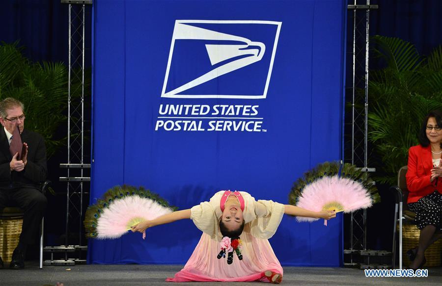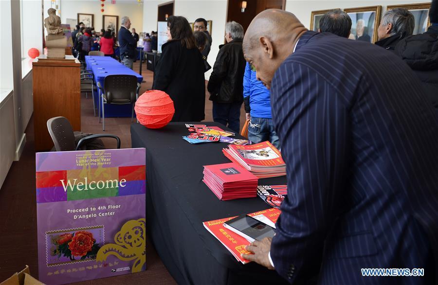 People perform lion dance during the official first-day-of-issue dedication ceremony of the Year of the Monkey Commemorative Forever Stamp at St. John's University Queens Campus in New York, the United States, on Feb. 5, 2016. The U.S. Postal Service rings in the Year of the Monkey by issuing the commemorative forever Stamp, which was designed by illustrator Kam Mak, a China's Hong Kong-born artist who grew up in New York City's Chinatown. (Photo: Xinhua/Wang Lei)