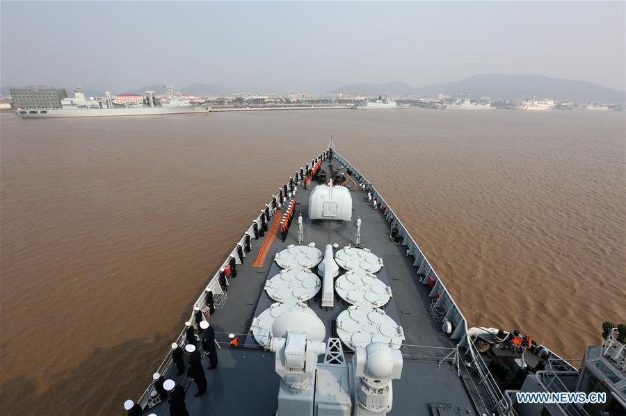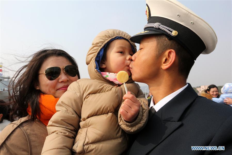 A naval officer kisses his child as he gets off board in a military port in Zhoushan, east China's Zhejiang Province, Feb. 5, 2016. The 152 Naval Fleet, comprised of destroyer Jinan, frigate Yiyang and supply ship Qiandaohu, returned home on Friday after escort missions in Somalian waters and a circumnavigation of the world that took them 309 days. (Photo: Xinhua/Zeng Tao)