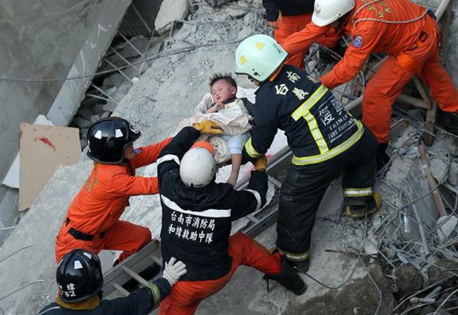 Rescuers lift a baby boy out of a collapsed 17-storey building in Tainan city February 6, 2014. A 6.7-magnitude earthquake hit southern parts Taiwan at a depth of 15 kilometers at 03:57 am Beijing time on Saturday. (Photo provided to China Daily)