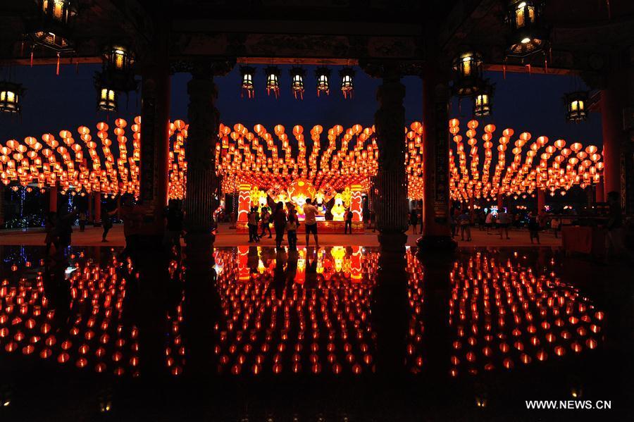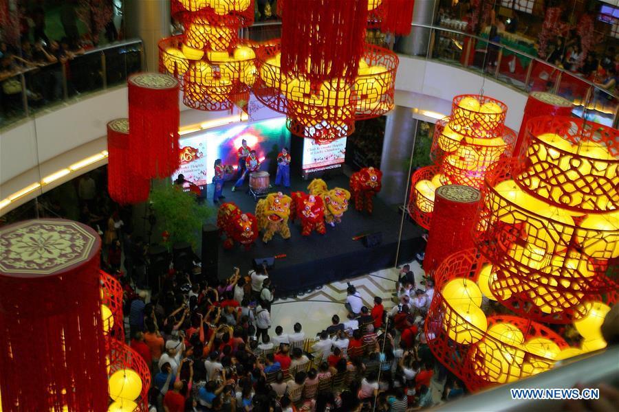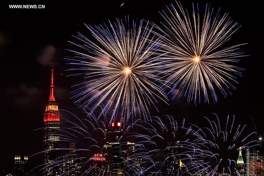 Photo taken on Feb. 6, 2016 from Weehawken of New Jersey, the United States, shows the fireworks over Manhattan of New York celebrating the Chinese lunar New Year. (Photo: Xinhua/Li Muzi)