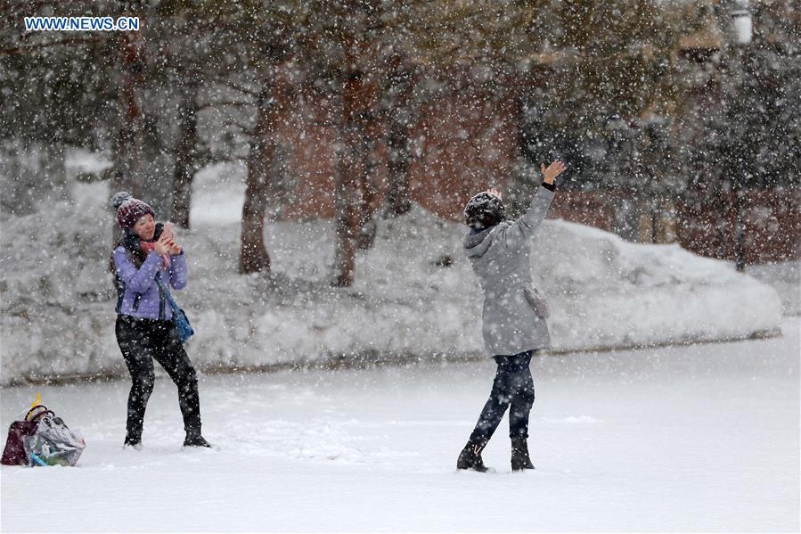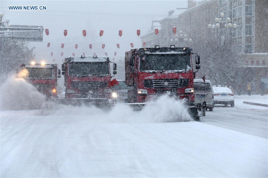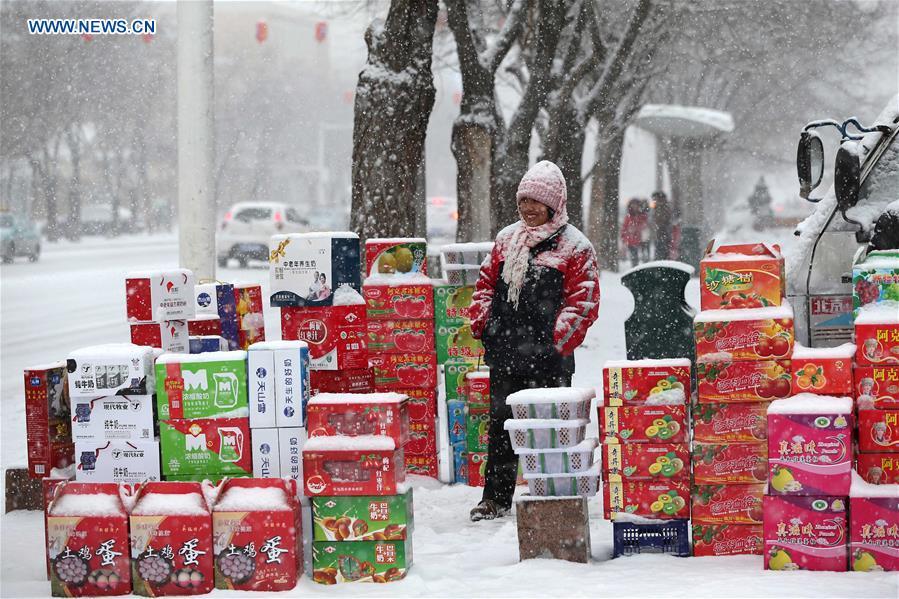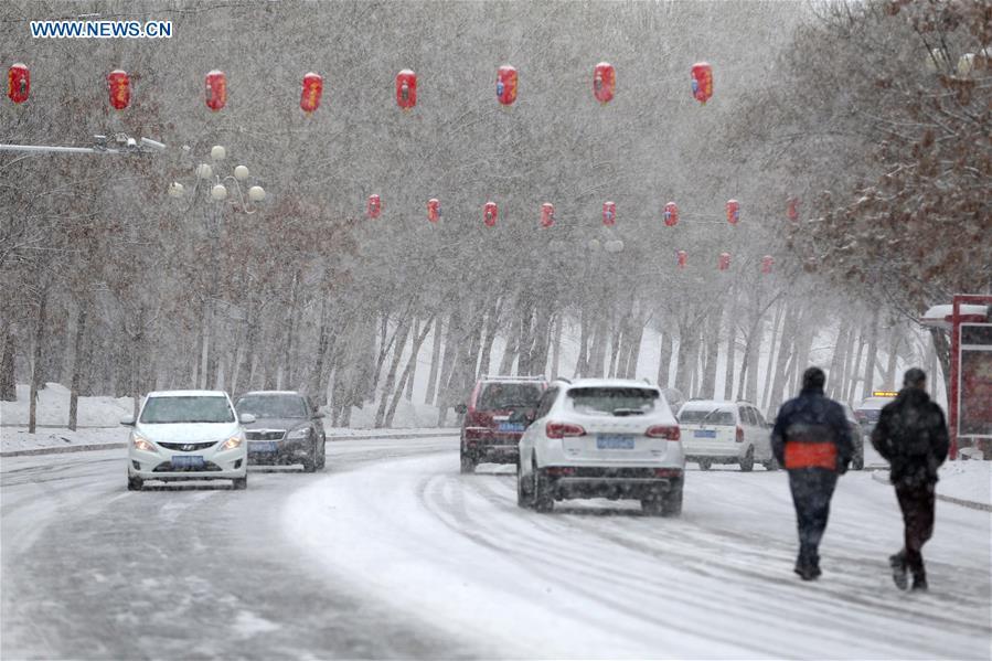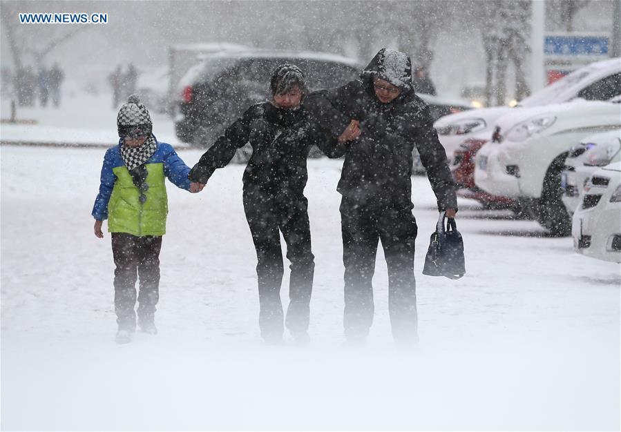 People walk in snow in Altay City, northwest China's Xinjiang Uygur Autonomous Region, Feb. 9, 2016. A cold front brought heavy snowfall to the city on Tuesday. (Photo: Xinhua/Tang Xiaobo)