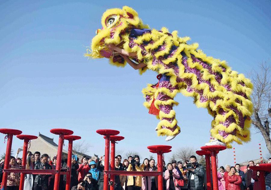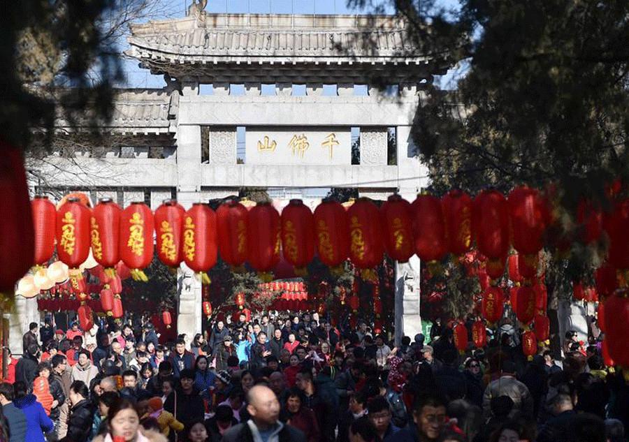 A child beats a drum for blessings during a traditional celebration for the Lunar New Year, or the Spring Festival, on the Qianfo Mountain in Jinan, capital of East China's Shandong province, Feb 8, 2016. (Photo/Xinhua)