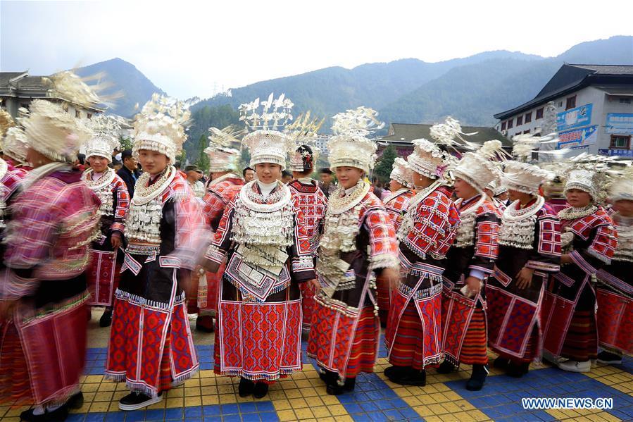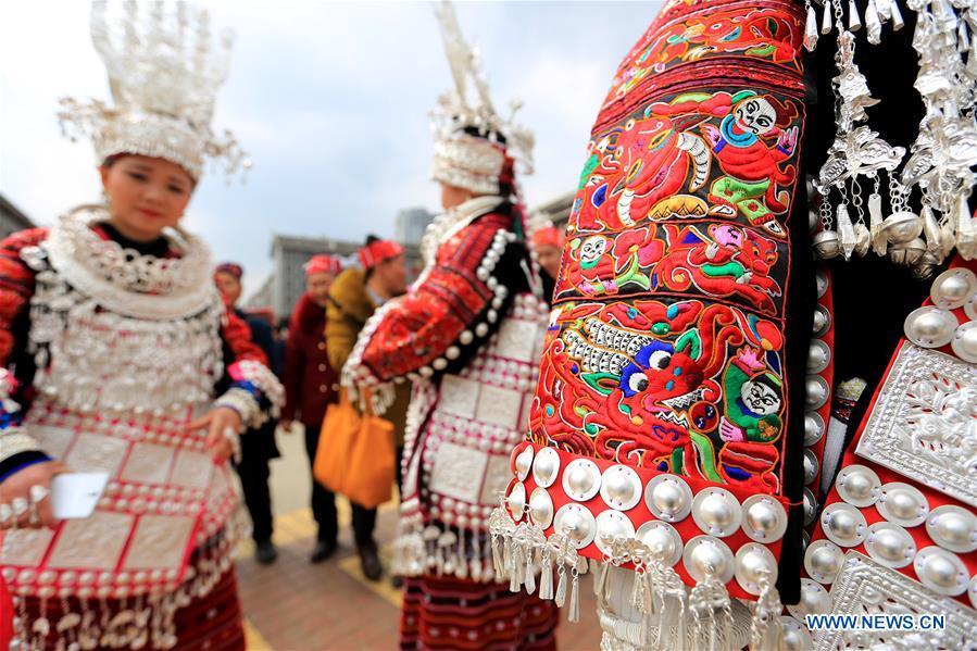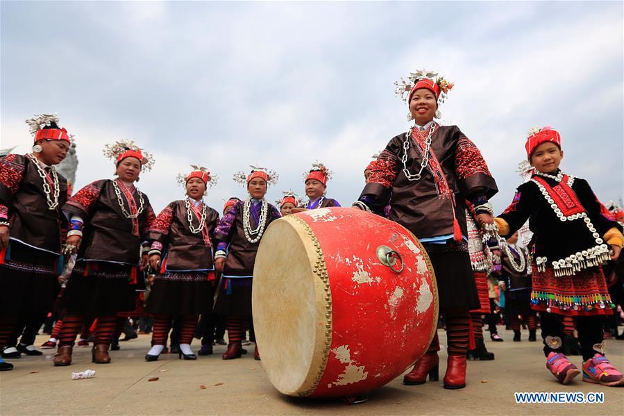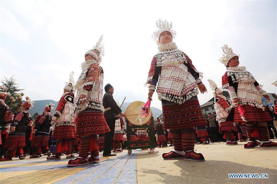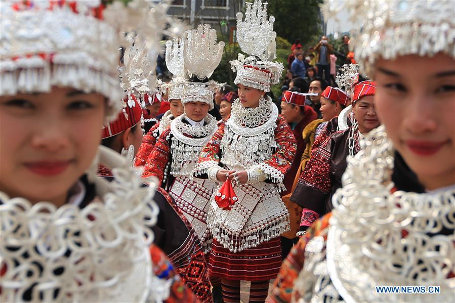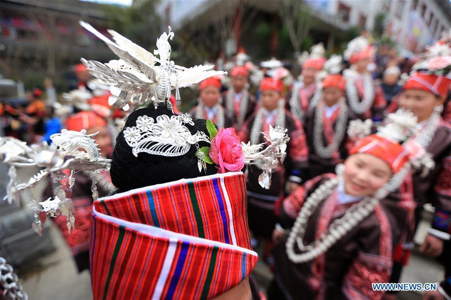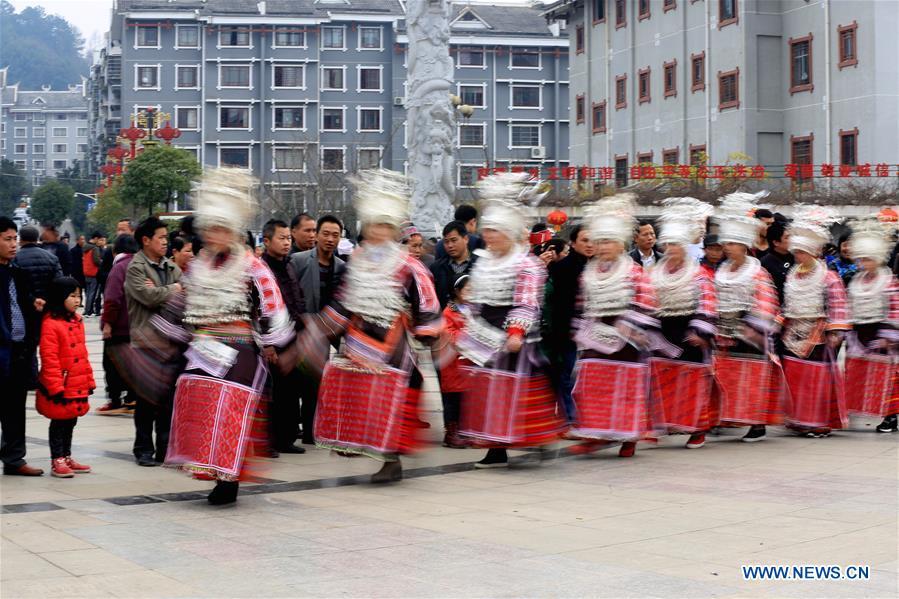 People of Miao ethnic group take part in a dancing contest in Jianhe County, southwest China's Guizhou Province, Feb. 11, 2016. Local people in festival array participated in the contest to celebrate the Spring Festival. (Xinhua/Wu Jibin)