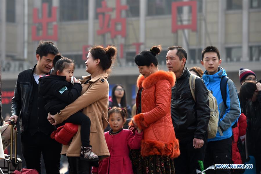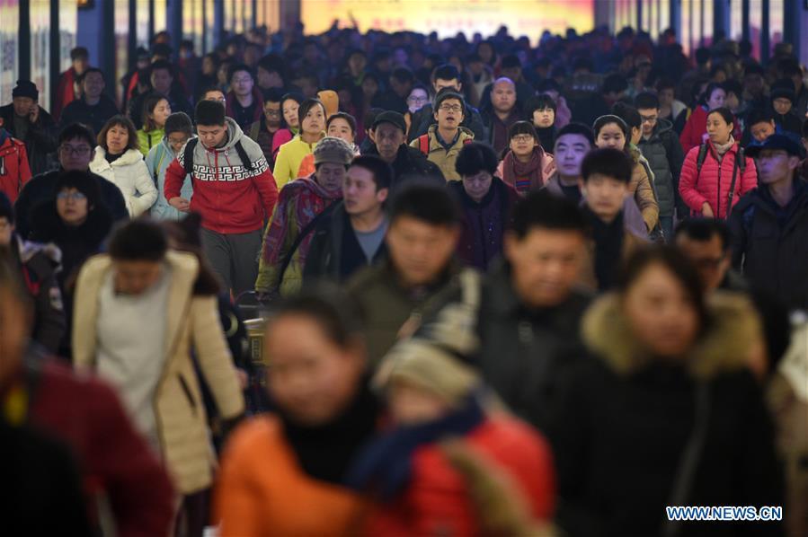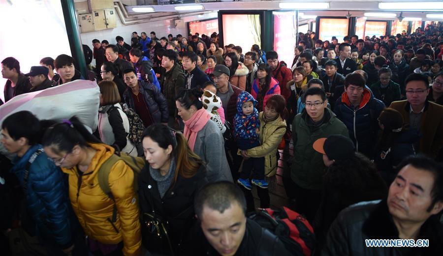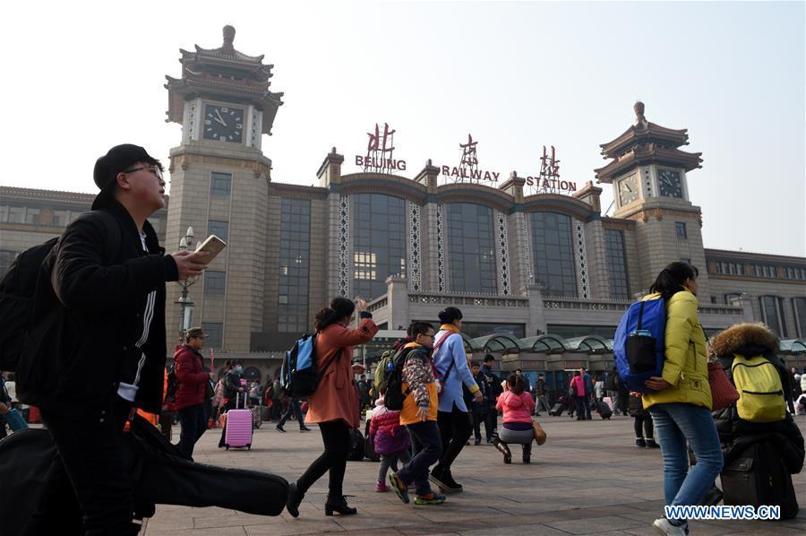 Passengers leave Beijing Railway Station in downtown Beijing, capital of China, Feb. 12, 2016. Railway stations around the nation witnessed surging passenger flows on Friday as the Spring Festival came to the end and people started to return to school and work. (Xinhua/Ju Huanzong)