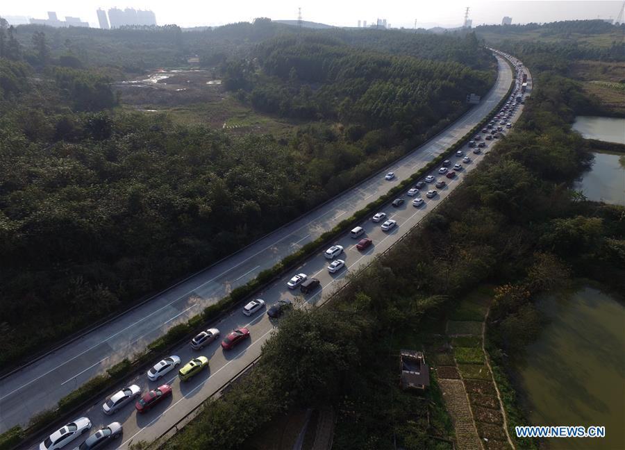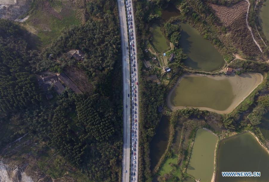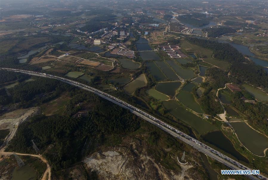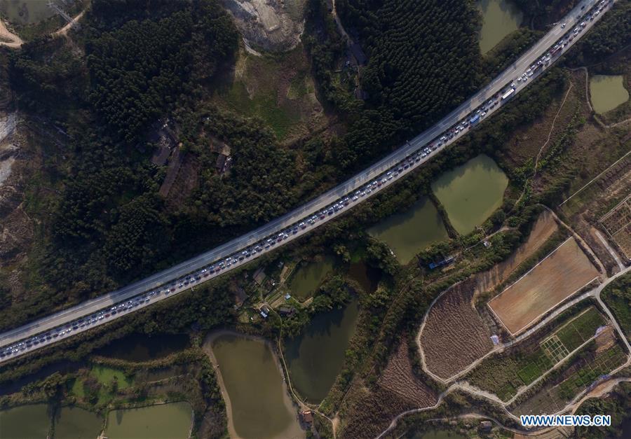 An aerial photo taken on Feb. 12, 2016 shows vehicles moving slowly on an expressway near Nanning, south China's Guangxi Zhuang Autonomous Region. Highways and railroads across China have seen increasing passenger flow while millions of Chinese return to work as the week-long Spring Festival holiday comes to an end. (Xinhua/Huang Xiaobang)