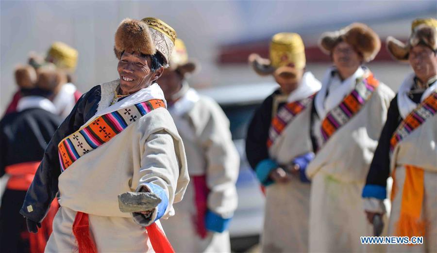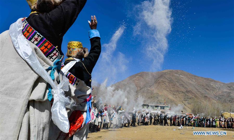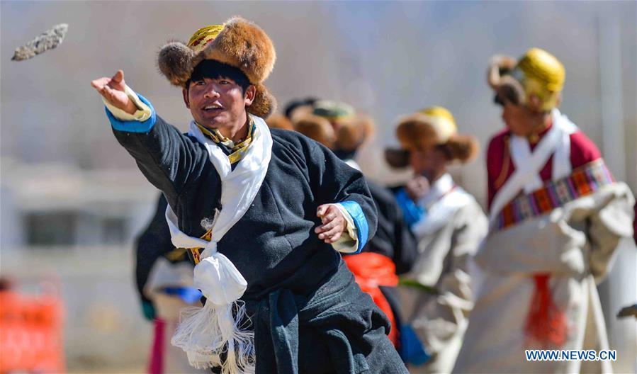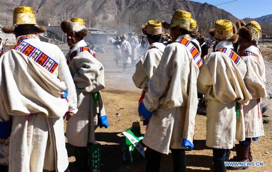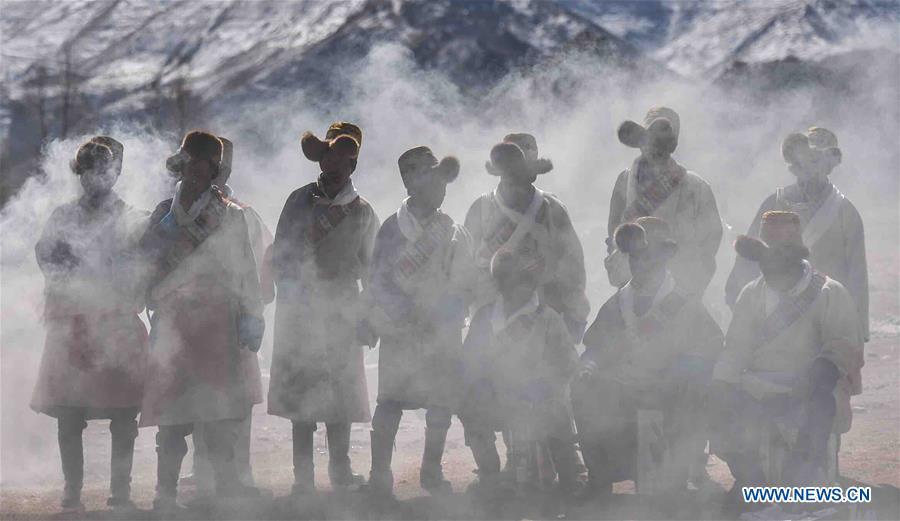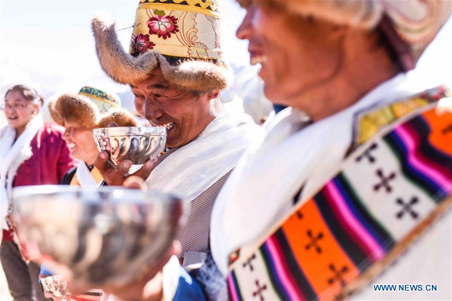 People drink during the ceremony of a game called "hit the horn", in celebration of Losar, the Tibetan New Year, in Dagze County, Lhasa, capital of southwest China's Tibet Autonomous Region, Feb. 12, 2016. The game, which literally means hitting the horn of an ox, is a traditional sports game in Tibet, symbolizes good luck if anyone successfully hits tip of the horn at a distance of more than 30 meters. (Xinhua/Purbu Zhaxi)