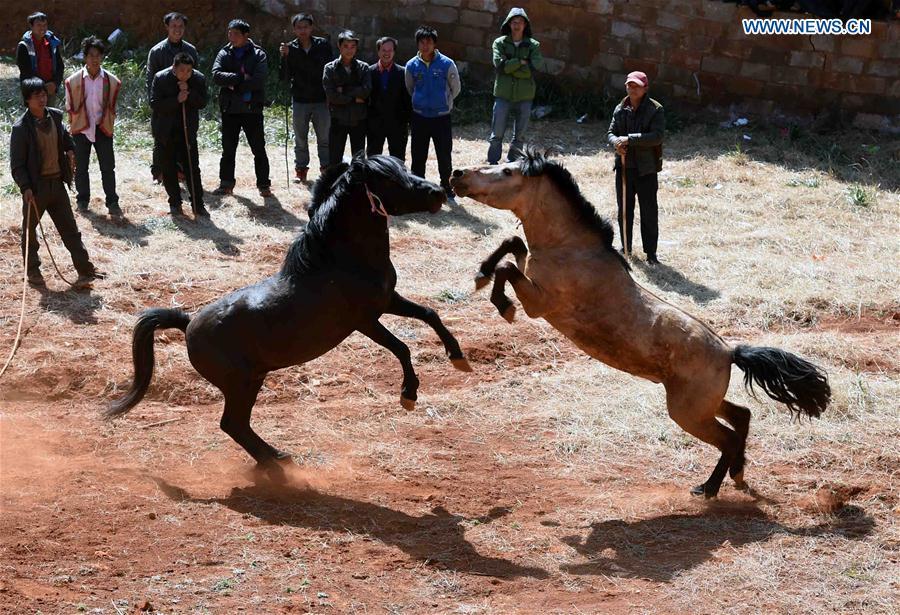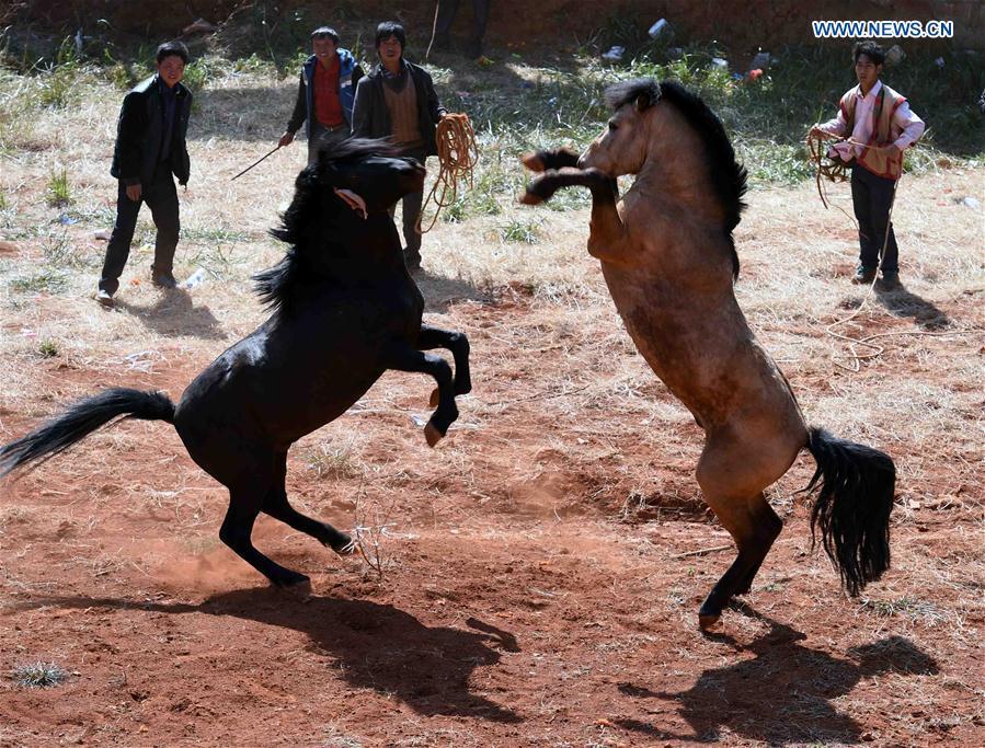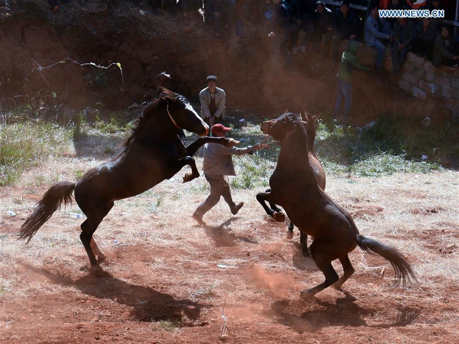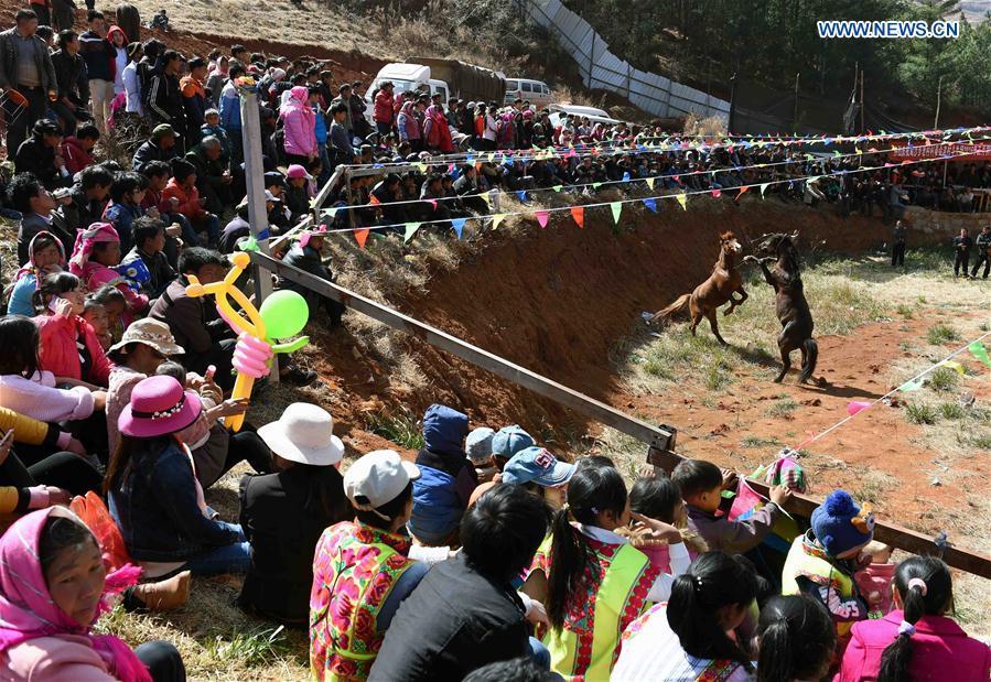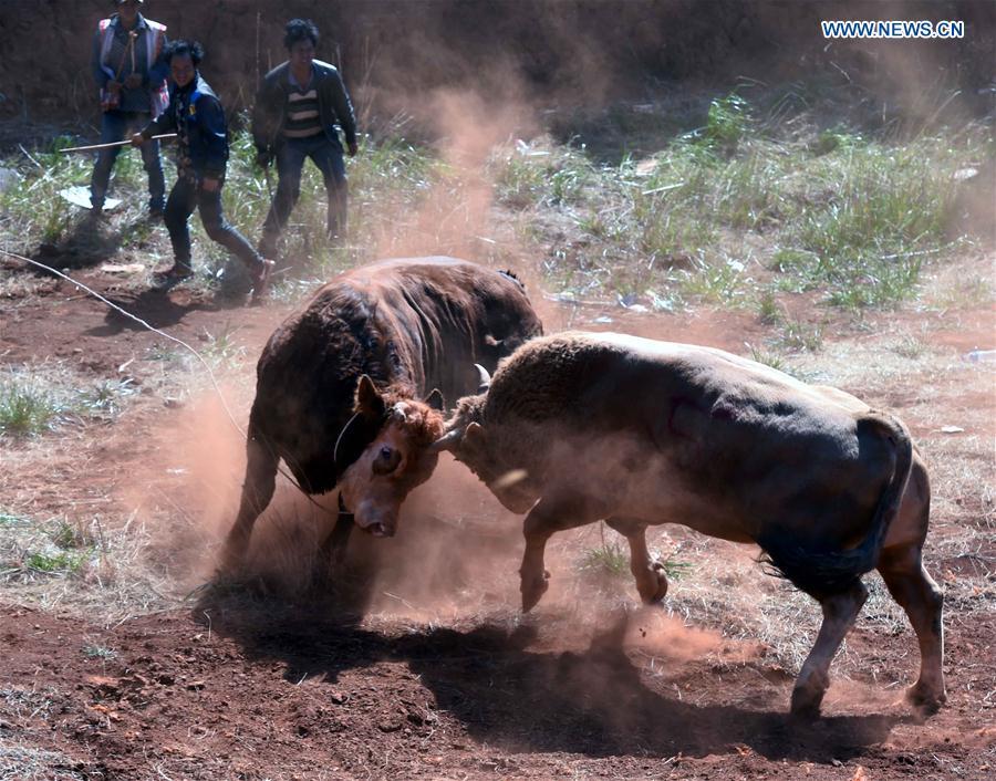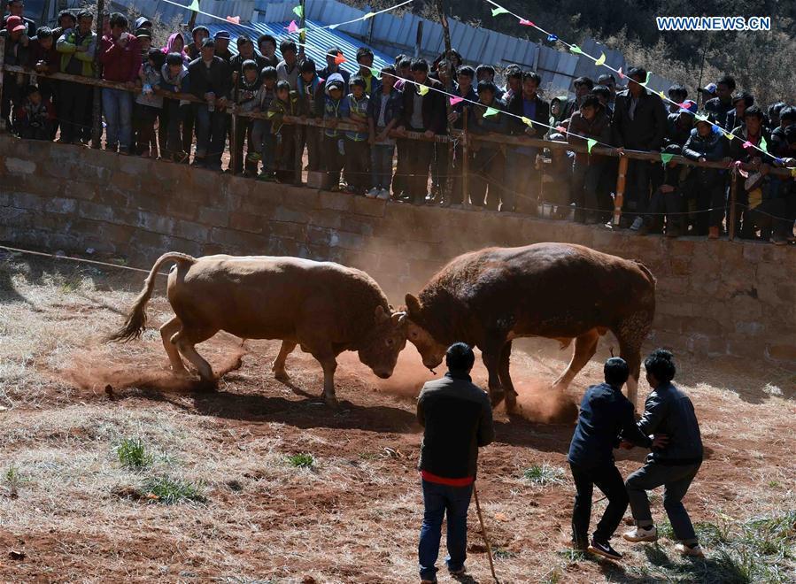 Residents watch a bull fight game in Hui-Yi Autonomous County of Xundian, southwest China's Yunnan Province, Feb. 13, 2016. Bull fight and horse fight games were held in Xundian on Saturday to celebrate the new spring. (Photo: Xinhua/Yang Zongyou)