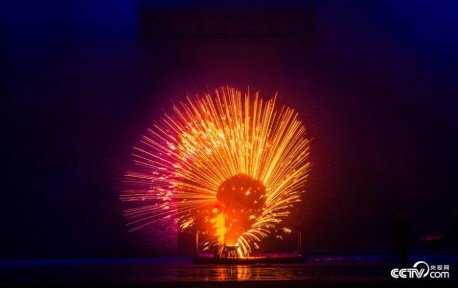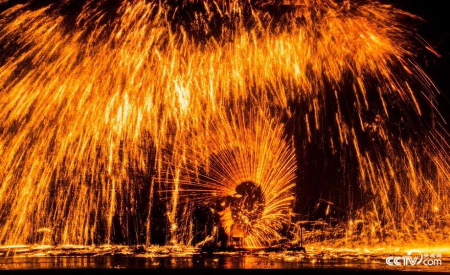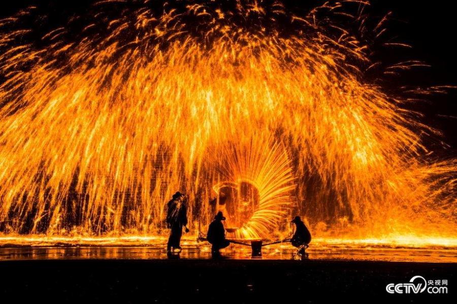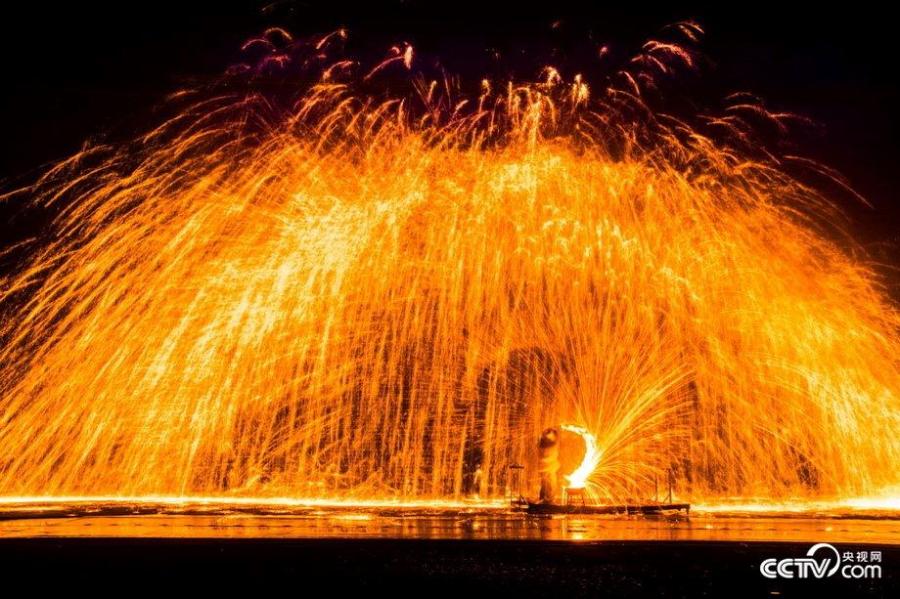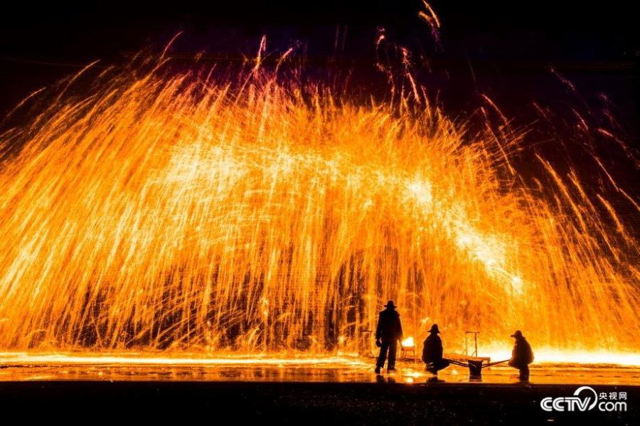 A shower of molten iron sparks like fireworks during a performance in Nuanquan town of Yuxian County, North China’s Hebei Province. The town has a history of over 500 years to carry out the tradition of spraying molten iron against a cold concrete wall to form sparks like fireworks. (Photo/cctv.com)