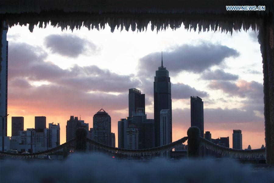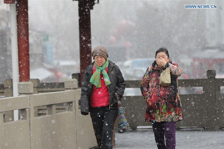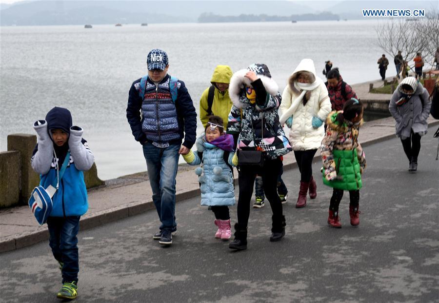 Tourists wearing thick clothes visit the West Lake in Hangzhou, capital of east China's Zhejiang Province, Feb. 14, 2016. A cold snap has brought strong wind, rain and snow to eastern region of China. (Photo: Xinhua/Shi Jianxue)